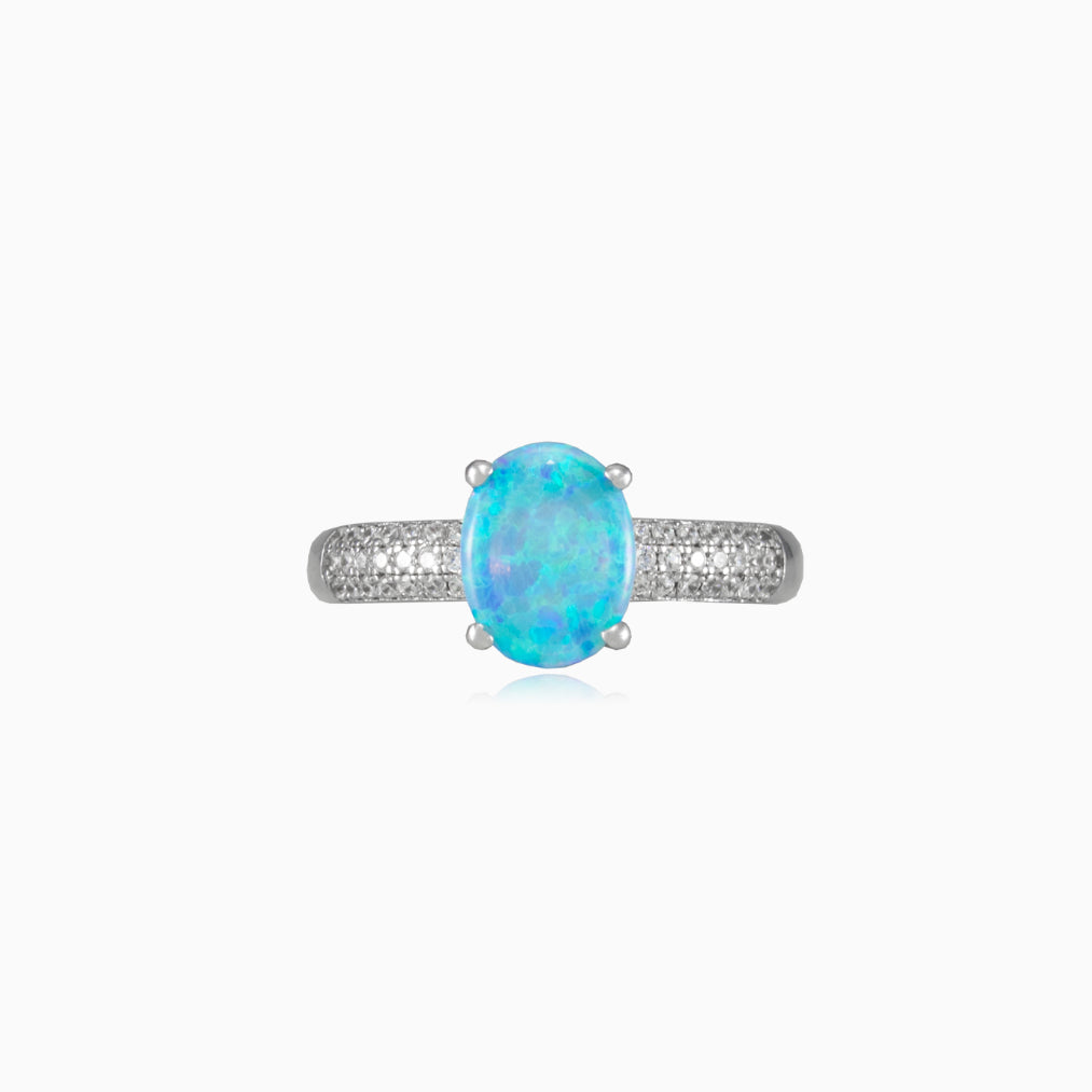 Dámský prsten ze stříbra v kombinaci s oválným broušeným modrým opálem a třemi řadami kubické zirkonie po stranách.