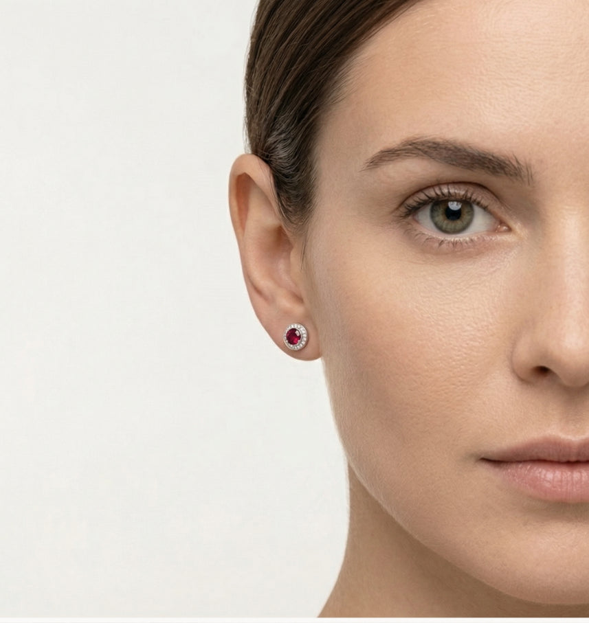 Kulaté stříbrné pecky kombinované s centrálním červeným syntetickým rubínem a aureolou z kubické zirkonie kolem.