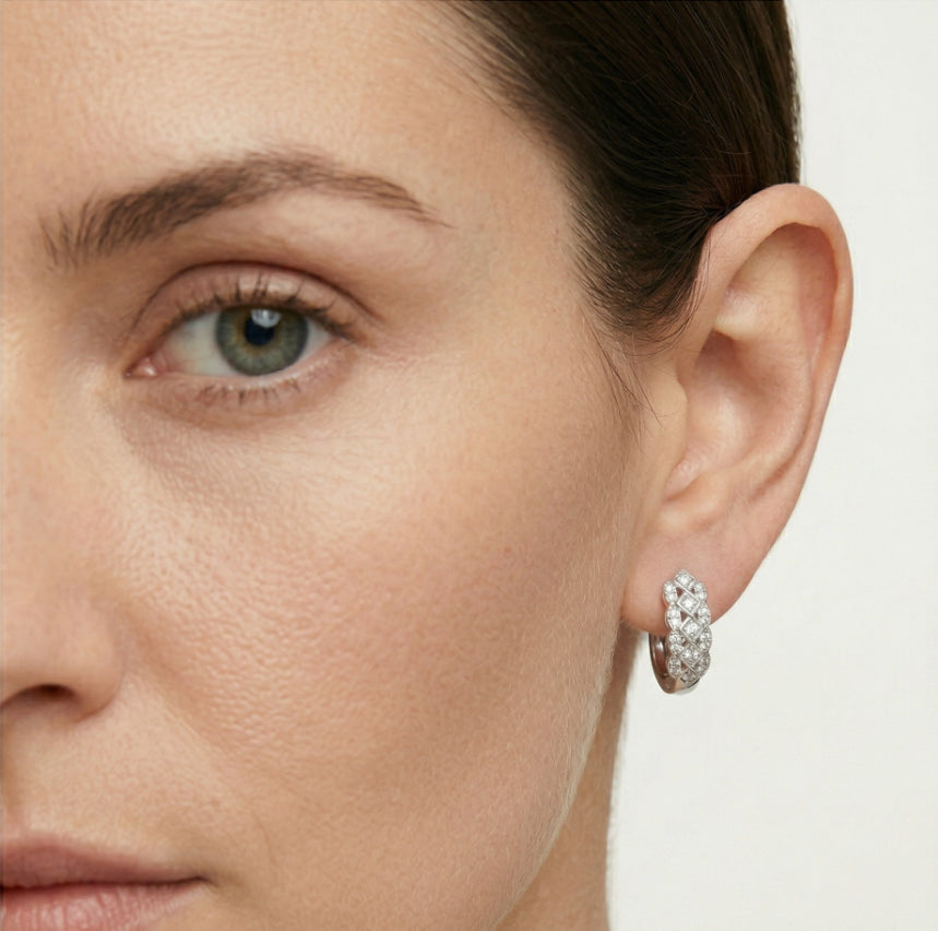 Moderní stříbrné náušnice s vypleteným předním dílem zdobeným kubickou zirkonií.