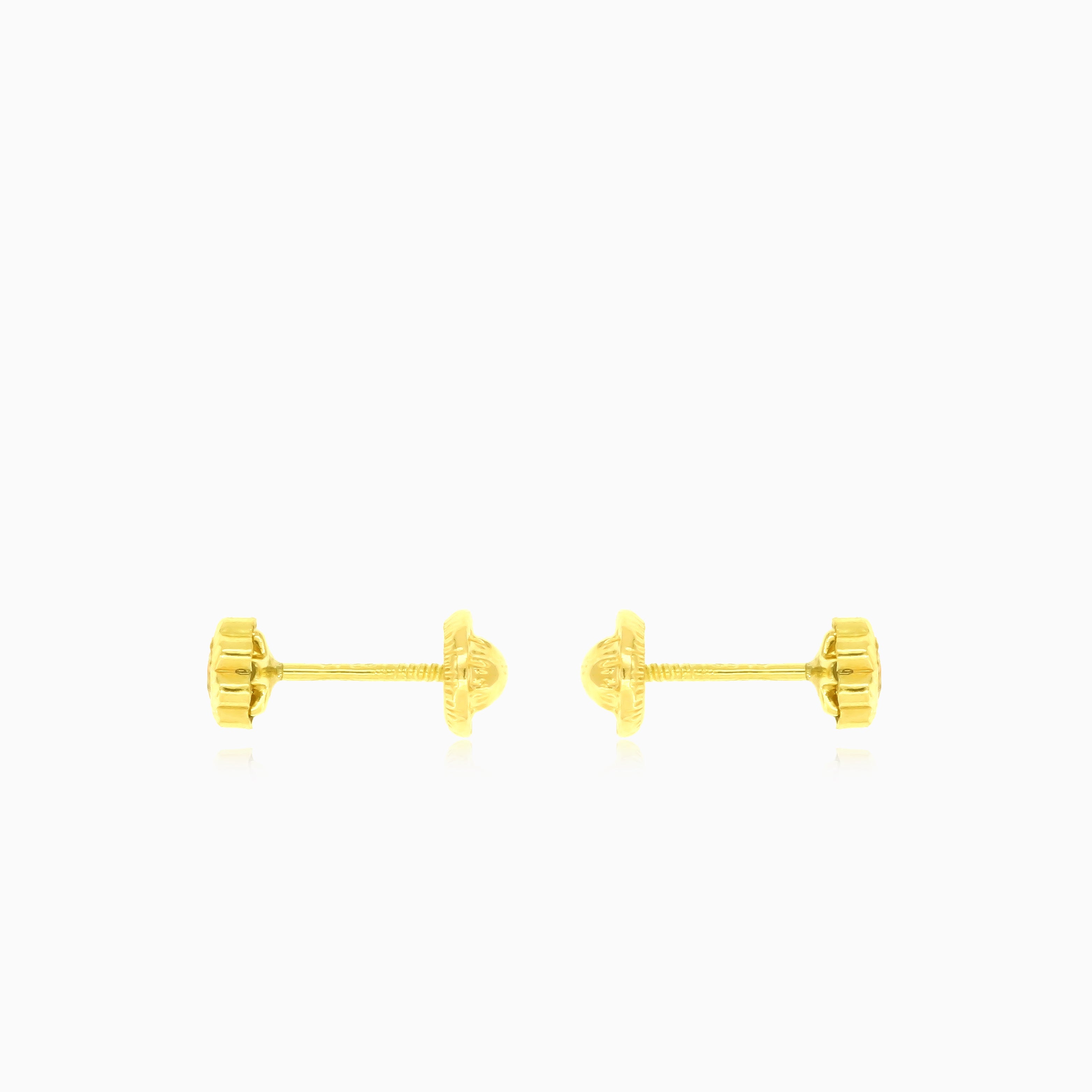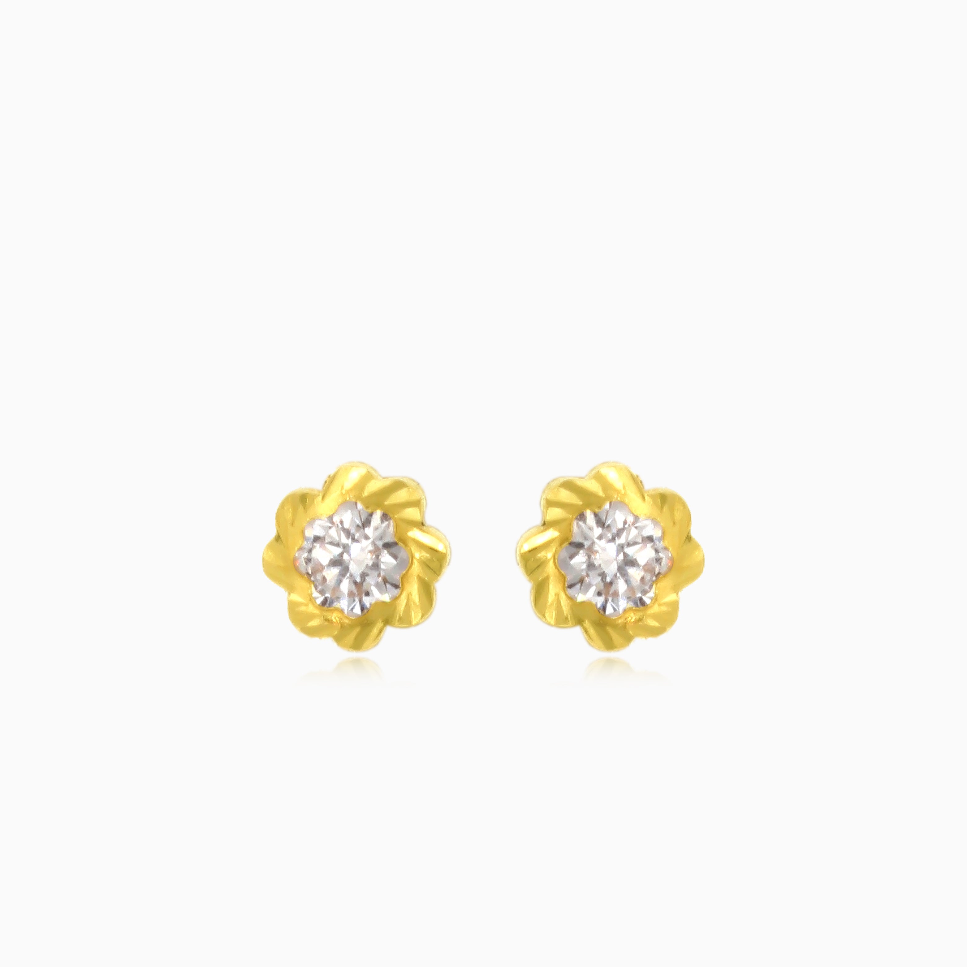 Drobné náušnice ve tvaru kytičky z 18kt žlutého zlata se šroubovacím zapínáním, s kulatým jemným zirkonem ve stupňovitém výbrusu, bezpečně zasazeným v rámečku pro ženy.