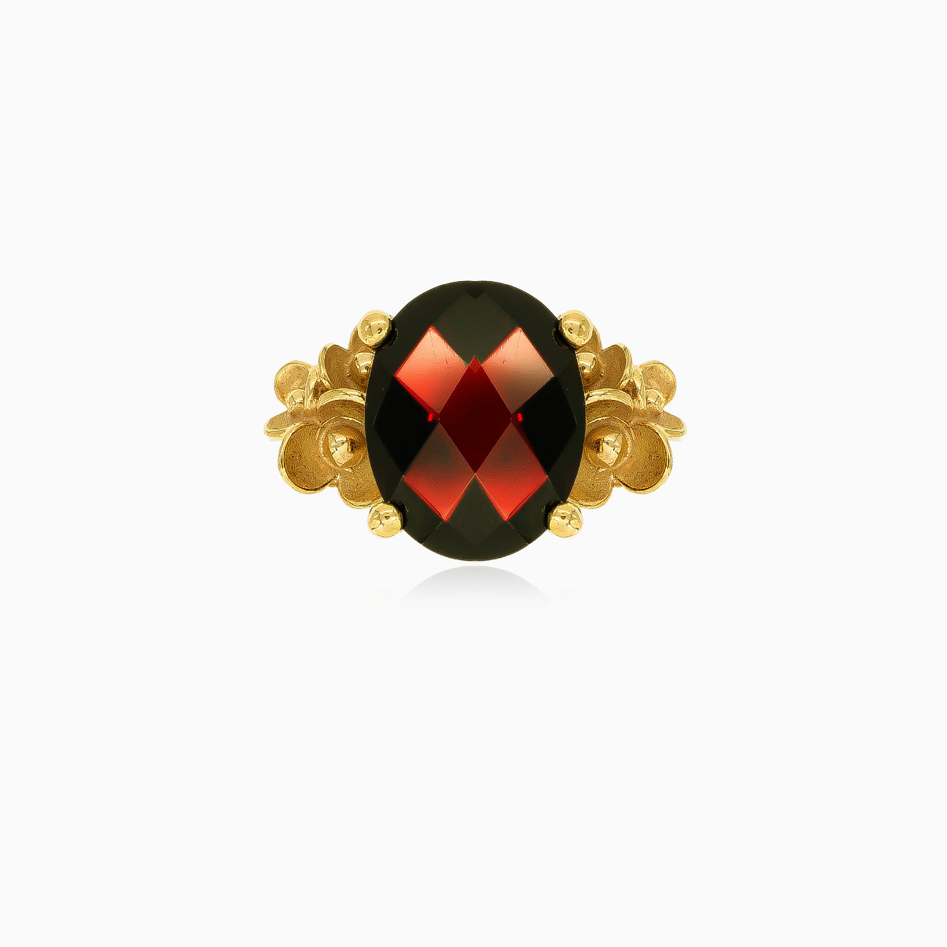 Ozdobte se tímto nádherným dámským prstenem s oválným granátem jemného stupňovitého brusu zasazeným ve čtyřpaprskovém osazení ze 14kt žlutého zlata, pečlivě ručně vyrobeným k dokonalosti.