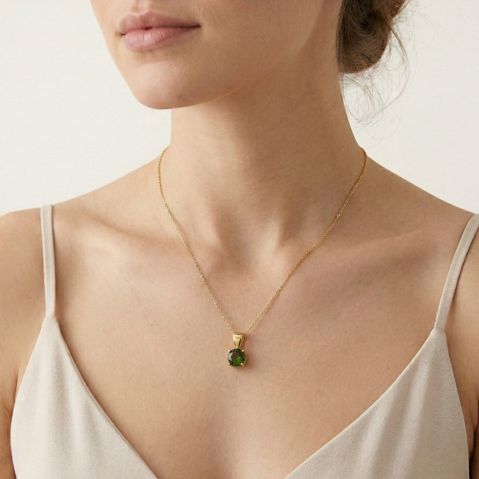 Dopřejte si luxus s tímto přívěskem ze 14kt žlutého zlata s fascinujícím kamenem vltavíem v kulatém jemném stupňovitém výbrusu. Kámen je důmyslně zajištěn elegantním osmičkovým zasazením, které ukazuje jeho přirozený lesk. Pozvedněte svůj styl tímto nadčasovým šperkem, který v sobě dokonale spojuje klasický design a sofistikovanost.