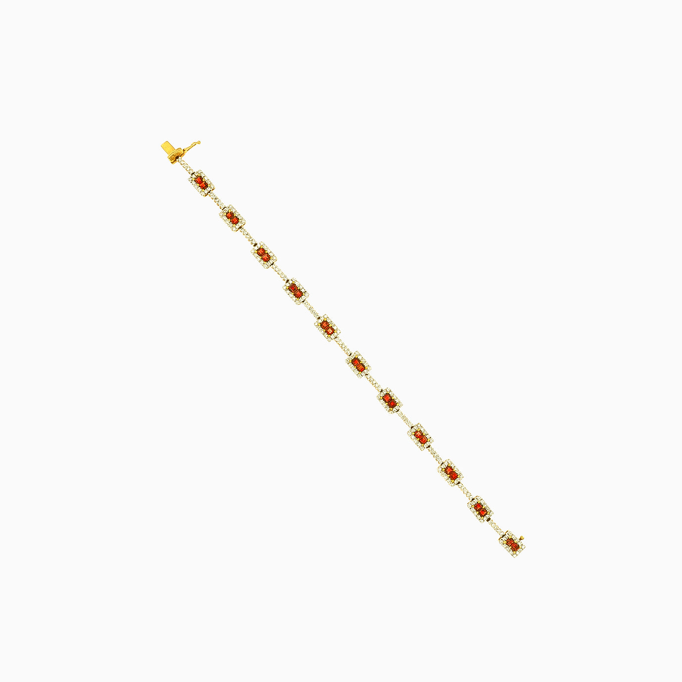 Ozdobte své zápěstí elegancí v tomto dámském náramku se čtvercovými granáty ve tvaru princezny a kulatými diamanty s jemným stupňovitým brusem o hmotnosti 1,52 ct, čistotě VS1 a barvě GH, zasazenými v luxusním 14kt žlutém zlatě se zasazením a otevřeným zapínáním, které vyzařuje královský půvab.