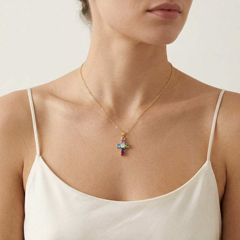 Přívěsek s křížkem inspirovaný mozaikou, zasazený ve 14kt žlutém zlatě, s polštářkovým jemným stupňovitým brusem se zářivými odstíny fialové, modré, červené a zelené barvy, vhodný pro ženy i muže.