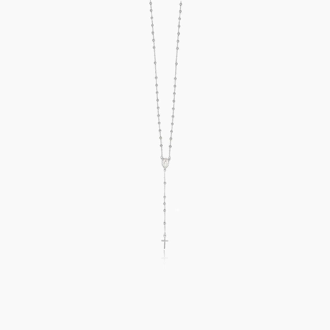 Tento jemný růženec je vyroben z 14kt bílého zlata. Doplněn je malými korálky s diamantovým leskem, na destičce je vyobrazen Ježíš. Celý náhrdelník je zakončen jemným křížem. Šperk je vybaven pružnou západkou pro snadné a bezpečné nošení.