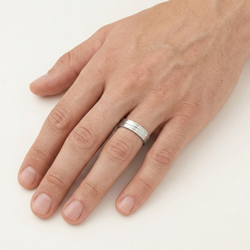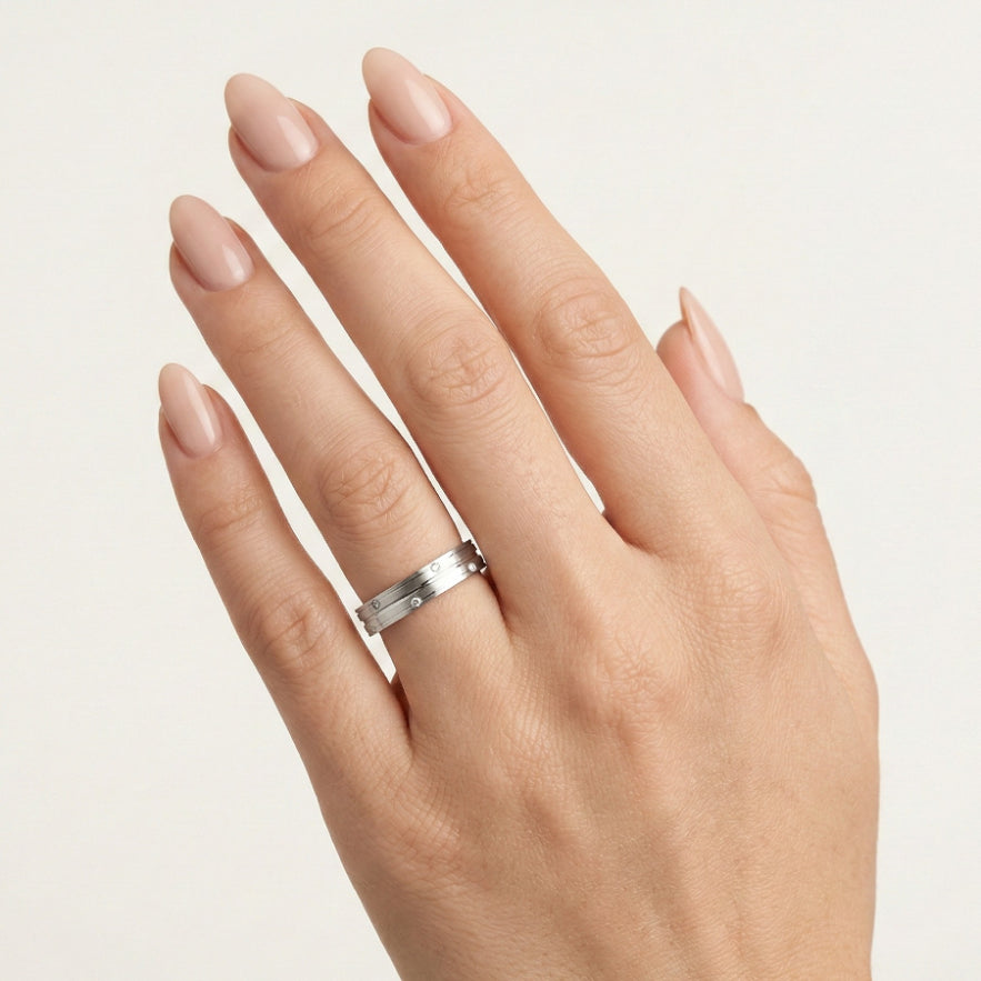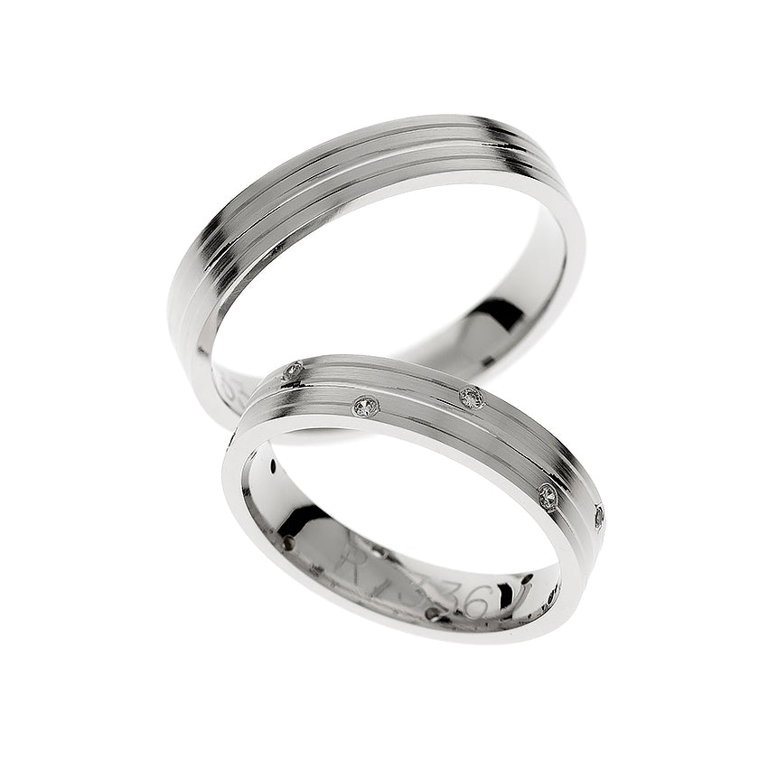Zažijte nadčasovou eleganci s našimi snubními prsteny z bílého 14kt zlata pro muže i ženy. První prsten má design věčnosti s 0,096ct kubickým zirkonem nebo diamantem v kulatém jemném stupňovitém výbrusu, zasazeným v rámečku s jedinečným klikatým vzorem. Druhý prsten je hladký. Oba prsteny mají tloušťku 4 mm s výraznými liniemi po obvodu.