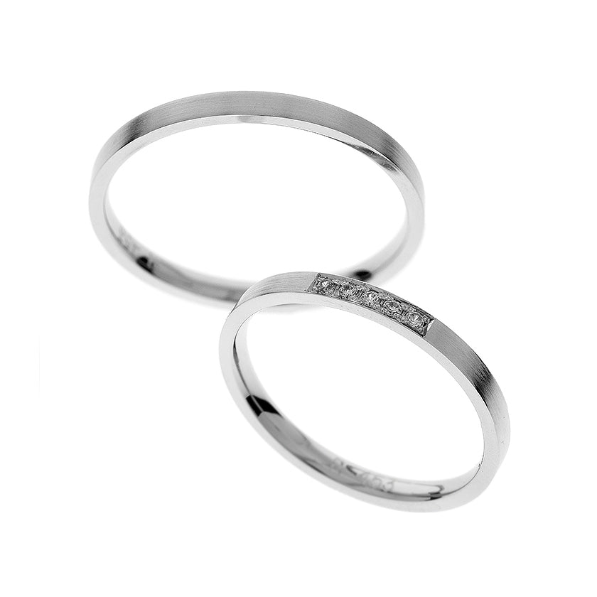 Objevte eleganci našich snubních prstenů z bílého 14kt zlata pro muže i ženy. První prsten obsahuje volitelný solitérní kubický zirkon nebo diamant o celkové váze 0,05 ct v kulatém jemném stupňovitém výbrusu se zasazením v rámečku. Druhý prsten je hladký, oba s vysoce leštěnou povrchovou úpravou a tloušťkou 2 mm, a nabízí tak velmi jednoduchý a decentní design.