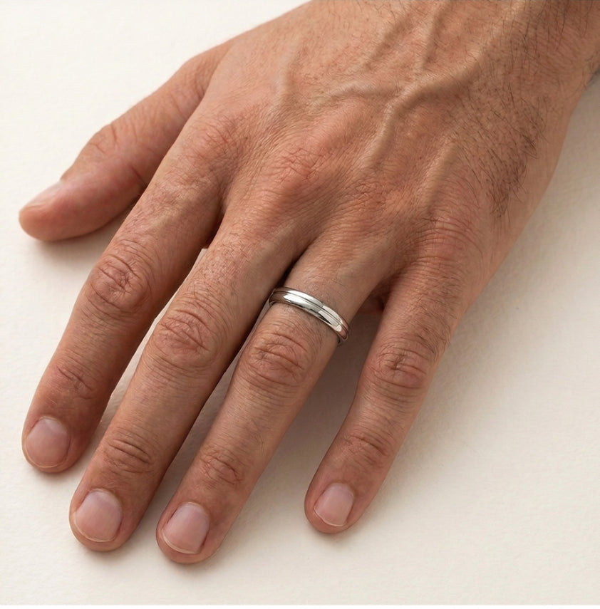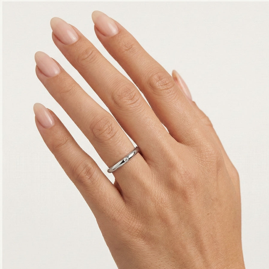 Objevte eleganci našich snubních prstenů z bílého 14kt zlata pro muže i ženy. První prsten obsahuje volitelný solitérní kubický zirkon nebo diamant o celkové váze 0,015 ct v kulatém jemném stupňovitém výbrusu s rámečkem. Druhý prsten je hladký, 3 mm silný, s vysoce leštěnou povrchovou úpravou a jemnou linií kolem něj, ideální pro symboliku věčné lásky.