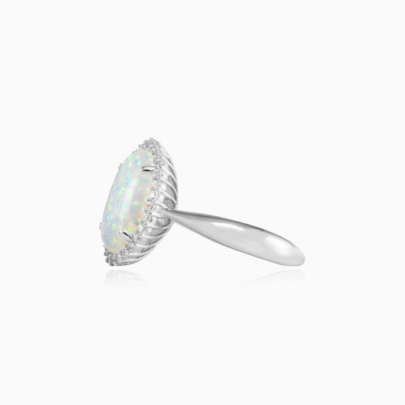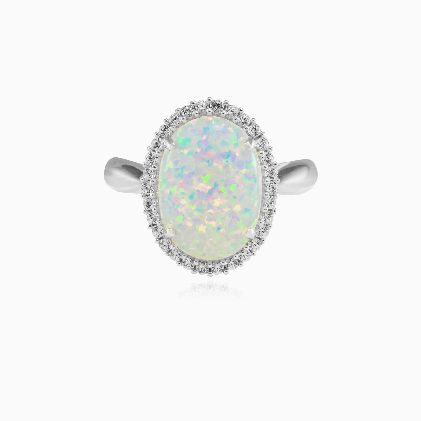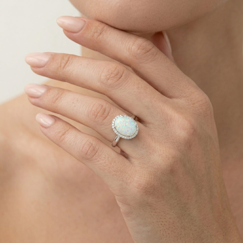 Tento úchvatný dámský prsten ze 14karátového bílého zlata má centrální kabošon oválného bílého opálu obklopený kulatými jemnými stupňovitě broušenými kubickými zirkony. Prsten je zasazen do zářezu a kombinuje jemnou duhovost s královským třpytem a nabízí půvabný a majestátní design.