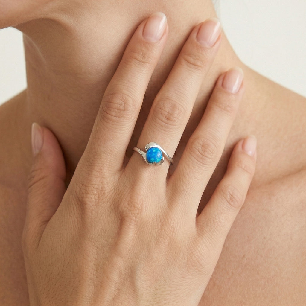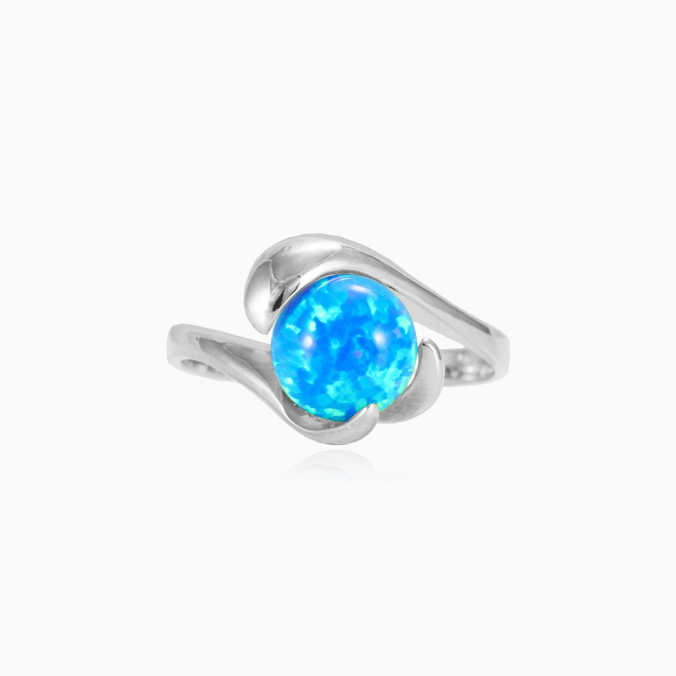 Tento dámský prsten z bílého 14kt zlata je osazen úchvatným kulatým modrým opálem v bezpečném zasazení. Díky svému zářivému odstínu a jedinečnému designu dodá tento šperk každé sbírce šperků nádech umělecké elegance a individuality.
