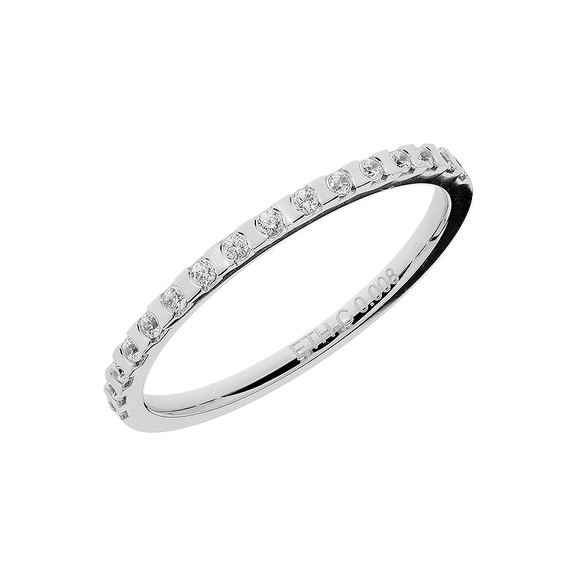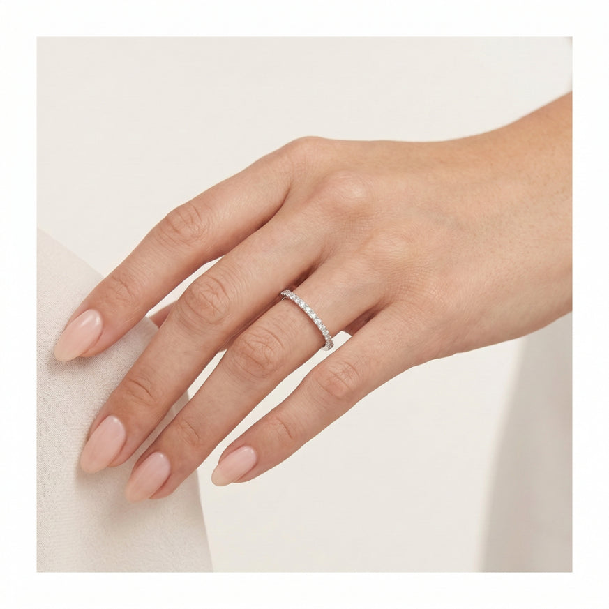 Dámský snubní prsten Sparkle ze 14kt bílého zlata se vyznačuje štíhlým designem s polovičním věčným páskem. Zdobené 0,128ct volitelných kamenů, vyberte si mezi kubickou zirkonií nebo diamanty. Kulaté jemné stupňovitě broušené kameny jsou zasazeny do barového prostředí a nabízejí jemný a rafinovaný vzhled.