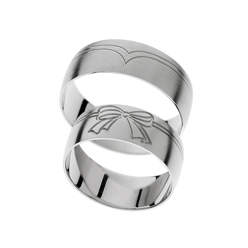 Tyto snubní prsteny z bílého 14kt zlata pro ženy i muže mají 7 mm široký prsten se stylovými gravírovanými detaily. Jeden prsten se pyšní elegantním designem motýlka, zatímco druhý představuje dvě linie sbíhající se do tvaru V. Tyto jedinečné prsteny bez kamenů představují pro páry sofistikovanou a smysluplnou volbu.
