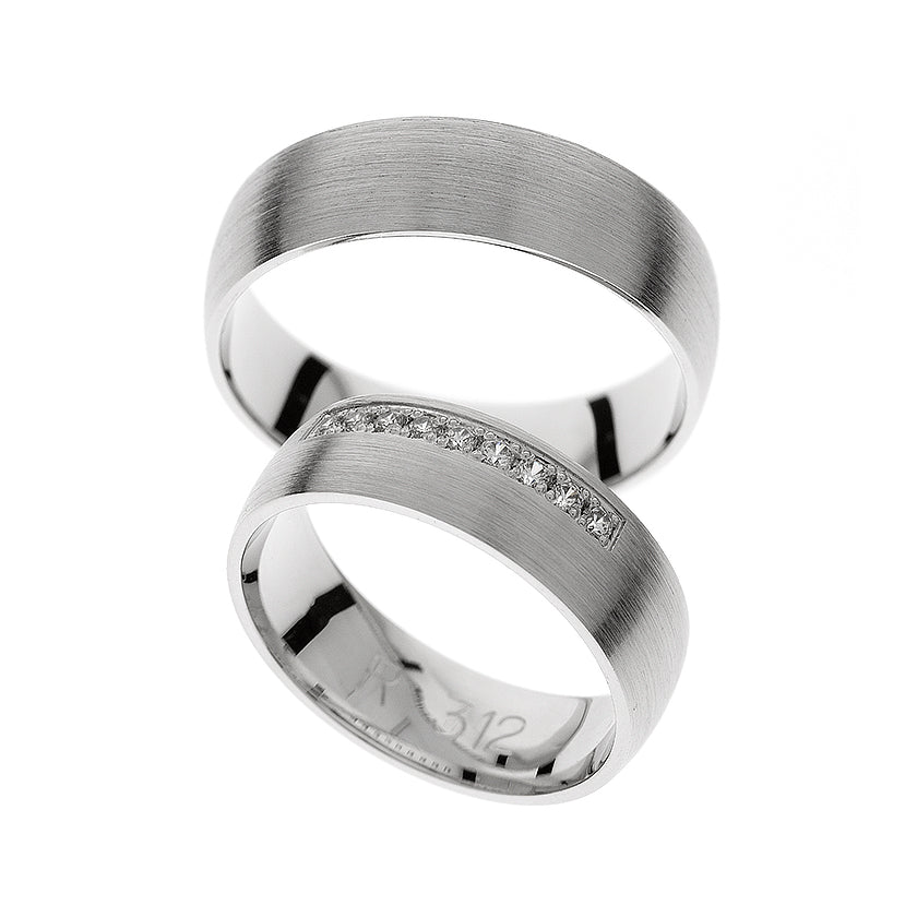 Objevte naše jedinečné snubní prsteny z bílého 14kt zlata pro muže a ženy. První prsten je vybaven volitelným 0,135ct kubickým zirkonem nebo diamantem v kulatém jemném stupňovitém výbrusu se zasazením, zatímco druhý prsten je hladký. Oba prsteny mají tloušťku 6 mm a kombinují klasickou eleganci s osobitým nádechem.