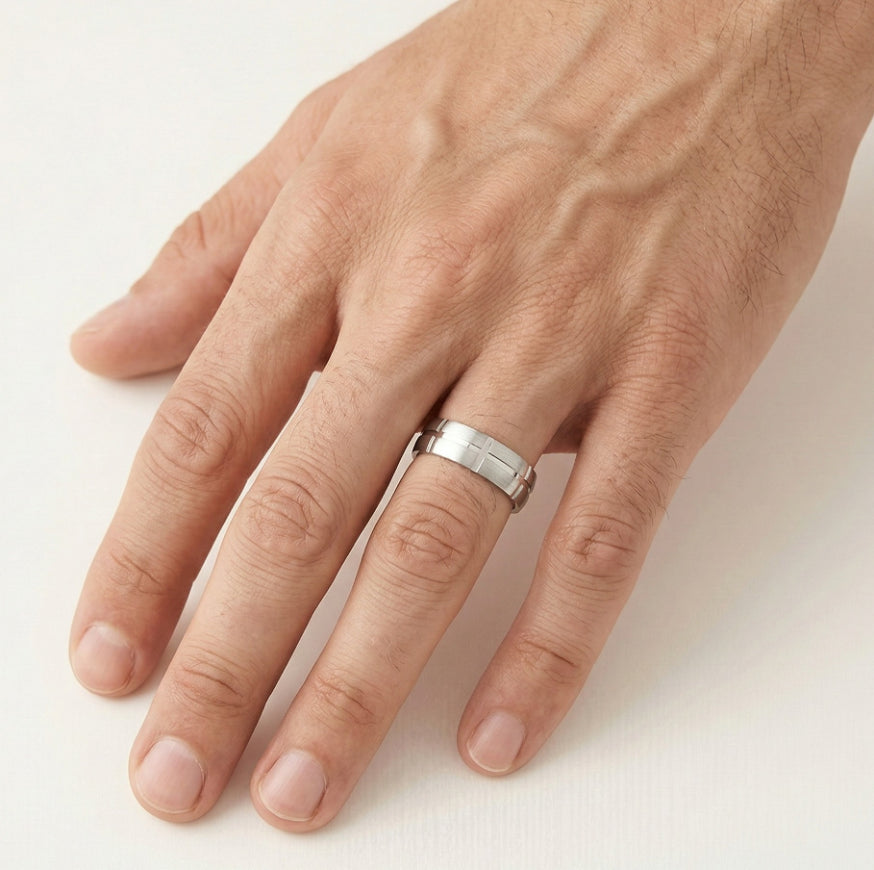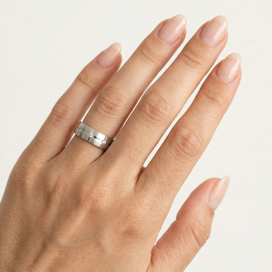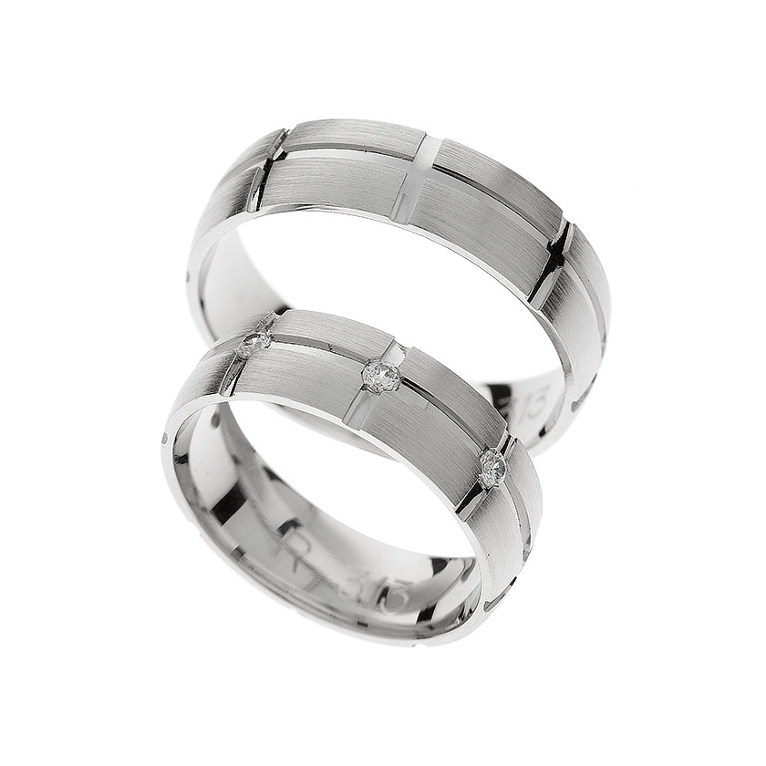 Objevte naše jedinečné snubní prsteny z bílého 14kt zlata pro muže a ženy. První prsten je vybaven volitelným 0,09ct kubickým zirkonem nebo diamantem v kulatém jemném stupňovitém výbrusu se zasazením, zatímco druhý prsten je hladký. Oba prsteny mají tloušťku 6 mm a zdobí je vyřezávaná linie kolem dokola a linie nad ní, což vytváří výrazný a elegantní design.