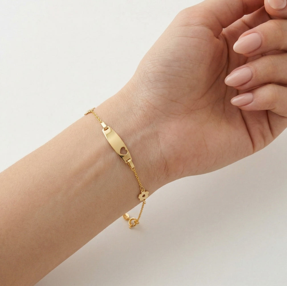 Ozdobte své zápěstí tímto zlatým náramkem ze 14kt žlutého zlata s dvěma jemnými květy a zlatou destičkou zdobenou tvarem srdce uprostřed.