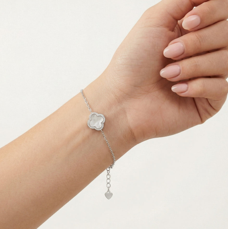 Dámský stříbrný náramek s řetízkem s jemným vzorem čtyřlístku zdobeným plochou perletí a třpytivou svatozáří z kulatých jemných zirkonů. Osazení hroty umocňuje lesk a bezpečnostní zapínání na pružinový kroužek dělá z tohoto náramku sofistikovaný a nadčasový šperk pro každou příležitost.