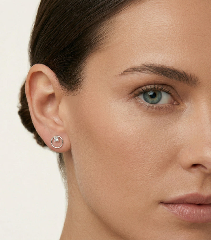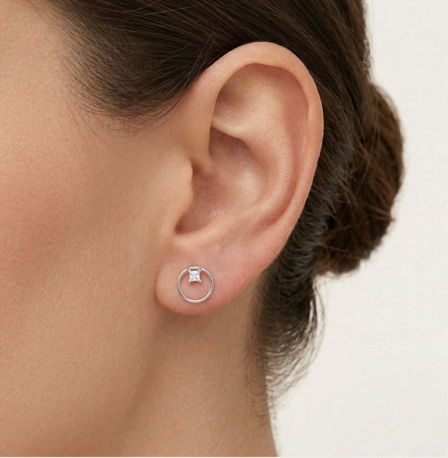 Vylepšete svůj styl těmito stříbrnými náušnicemi s kruhovým designem zdobeným třpytivým čtverečkem kubické zirkonie uprostřed.