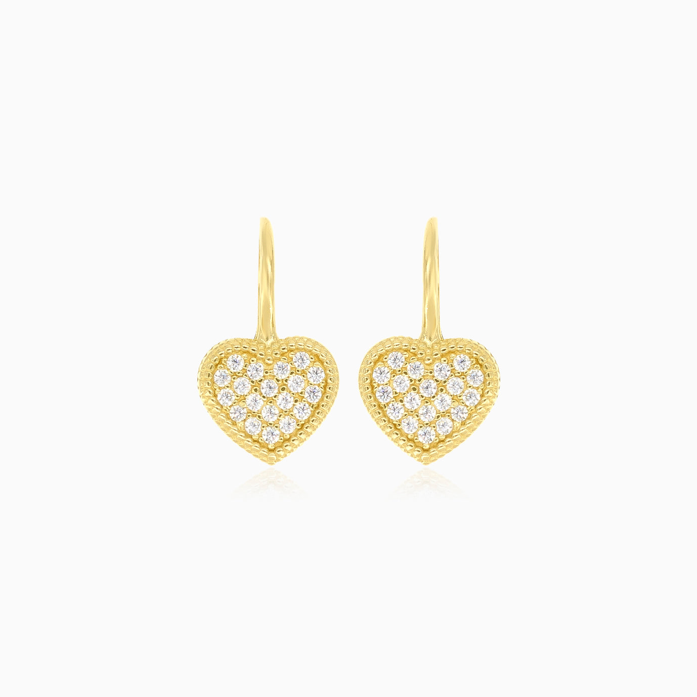 Vylepšete svůj styl těmito elegantními náušnicemi s kulatými zirkony jemného stupňovitého brusu. Náušnice jsou vyrobeny ze 14kt žlutého zlata se zapínáním na afroháčky a mají okouzlující design srdce. Jsou zajištěné páčkovým zapínáním a dodají každému outfitu nádech jiskry a romantiky.