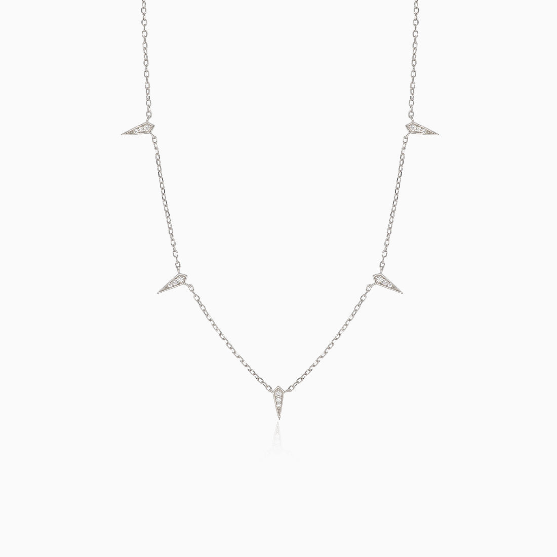 Tento náhrdelník je vyroben ze stříbra 925 a vyniká pěti články ve tvaru hrotů. Každý osten je zdoben kulatými zirkony, které mu dodávají jiskru. Šperk nabízí nastavitelnou délku a je vybaven zapínáním na pružinový kroužek.