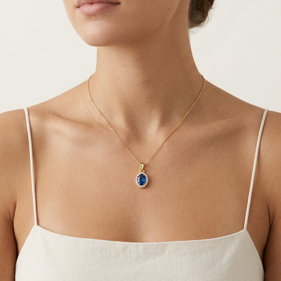 Přívěsek z 14-karátového žlutého zlata s oválně broušeným syntetickým safírem a aureolou kubické zirkonie.