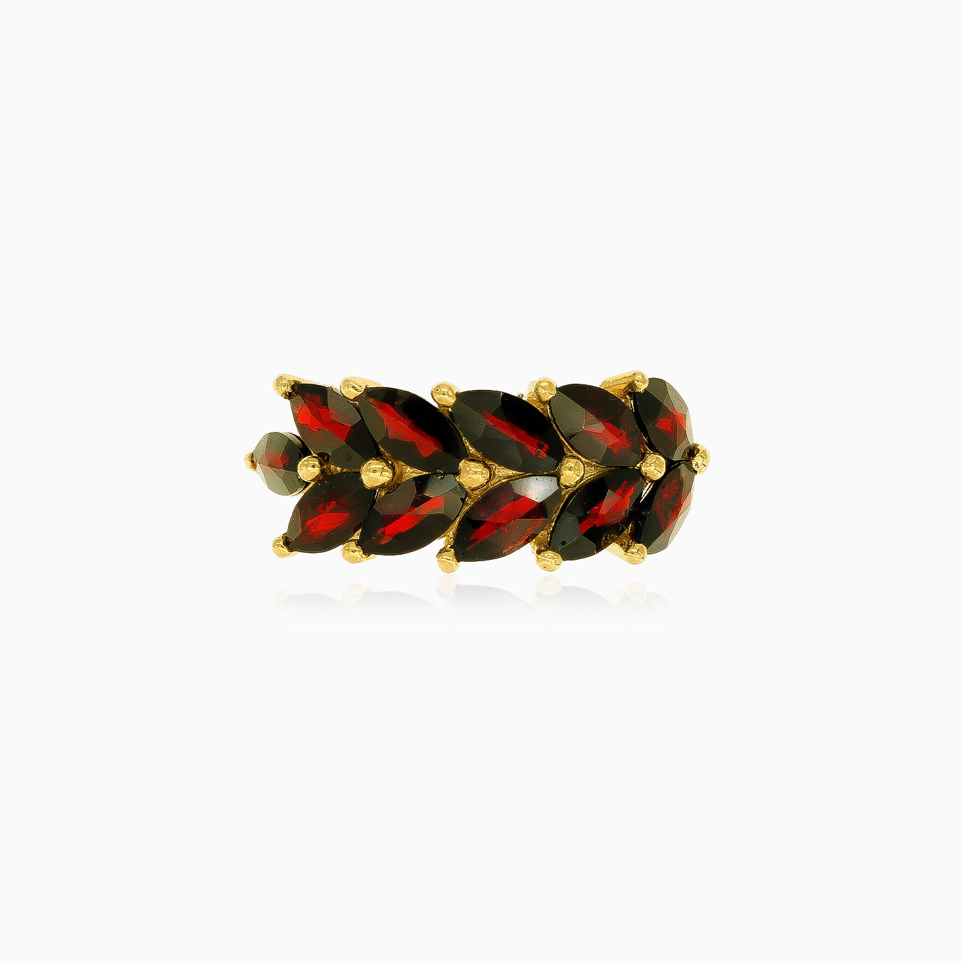 Dodejte svému outfitu nádech elegance s tímto dámským prstenem s markýzovým granátem jemného stupňovitého brusu zasazeným do dvouvýstupkové soupravy ze 14kt žlutého zlata, zdobeným symbolem olivové ratolesti.