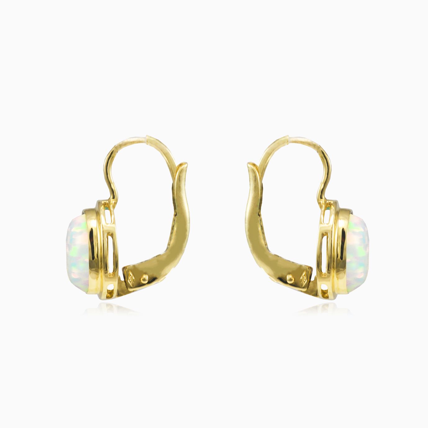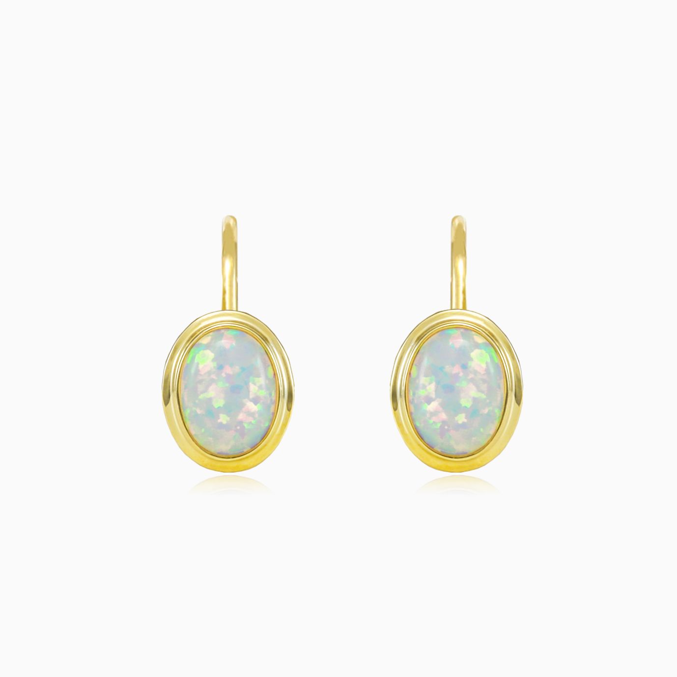 Klasické náušnice z 14-karátového žlutého zlata s bílým opálem oválného brusu v luneta osazení.