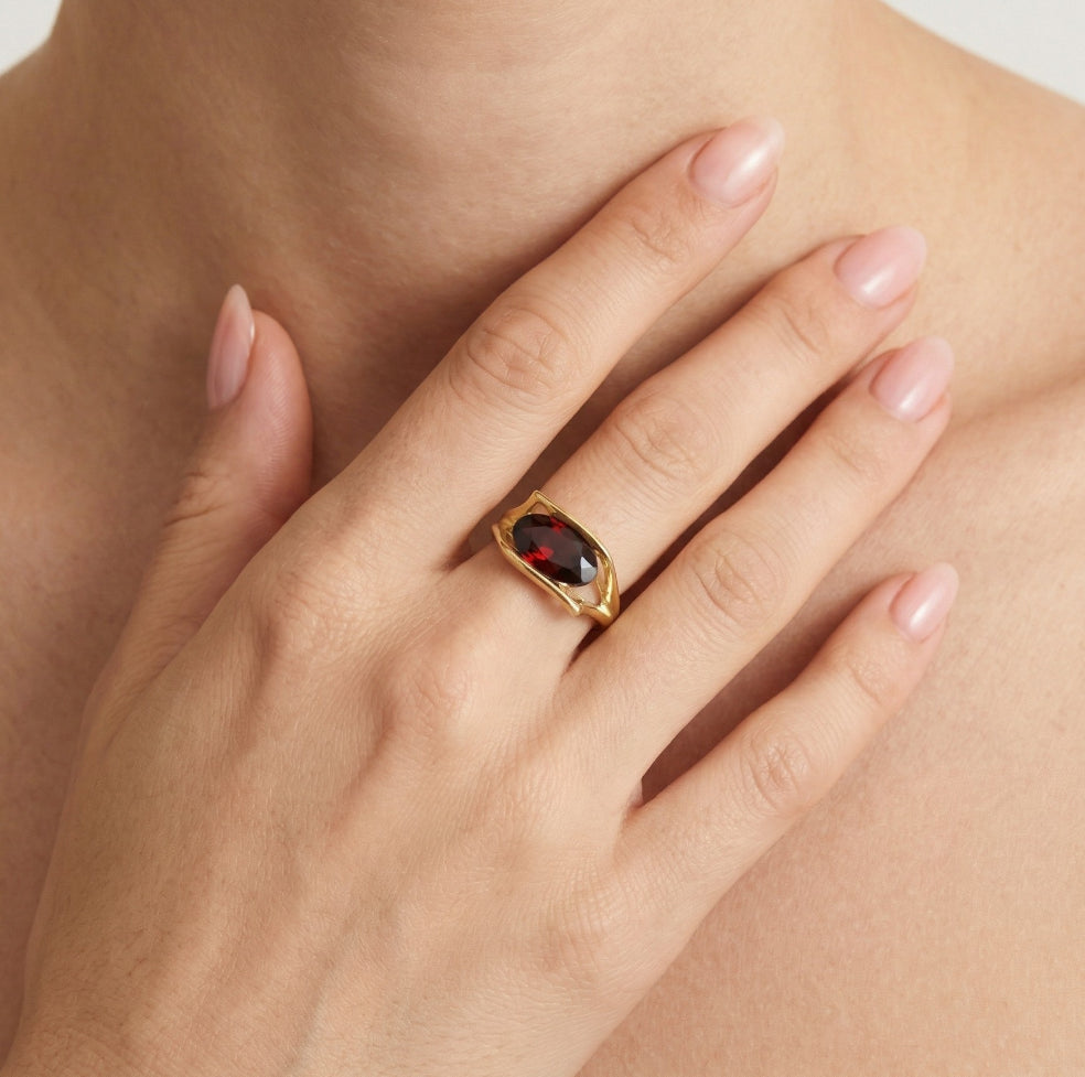 Ozdobte svůj prst elegancí v tomto dámském prstenu s oválným granátem s jemným stupňovitým výbrusem, který je zasazen do 14kt žlutého zlata a je ideální pro dodání sofistikovanosti každému kompletu.