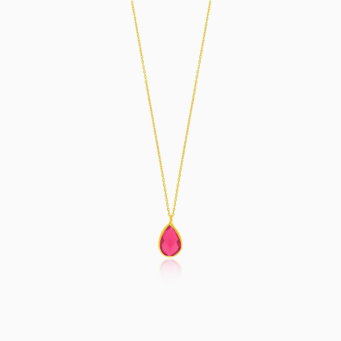 Vyrobeno z 14kt žlutého zlata, tento elegantní náhrdelník má přívěsek ve tvaru kapky se syntetickým rubínem. Náhrdelník má bezpečné zapínaní kroužek s pružinou.