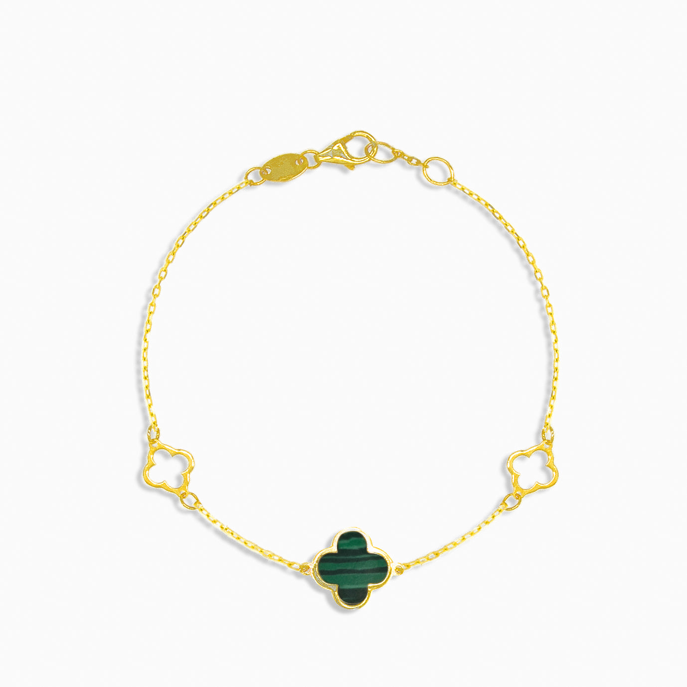 Jemný zlatý řetízkový náramek 14kt zdobený dvěma prázdnými čtyřlístky a jedním plným čtyřlístkem se zeleným achátem uprostřed.