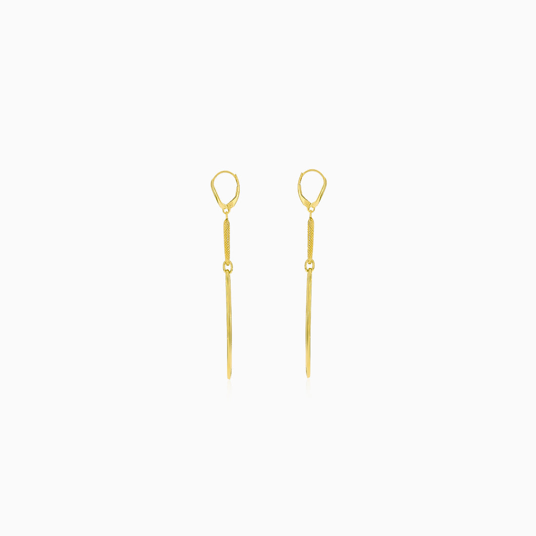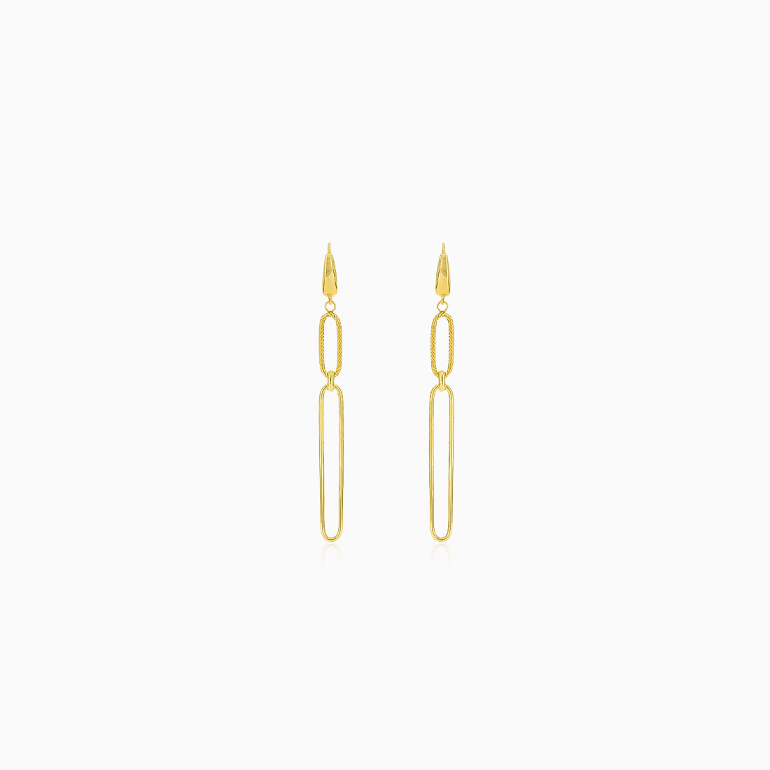 Tyto náušnice s řetězovými články jsou vyrobeny z 14kt žlutého zlata. Vrchní menší článek je zdoben jemným zkrouceným drátem, zatímco spodní článek vyniká vysokým leskem. Jsou opatřeny anglickým patentem pro snadné a elegantní zapínání.
