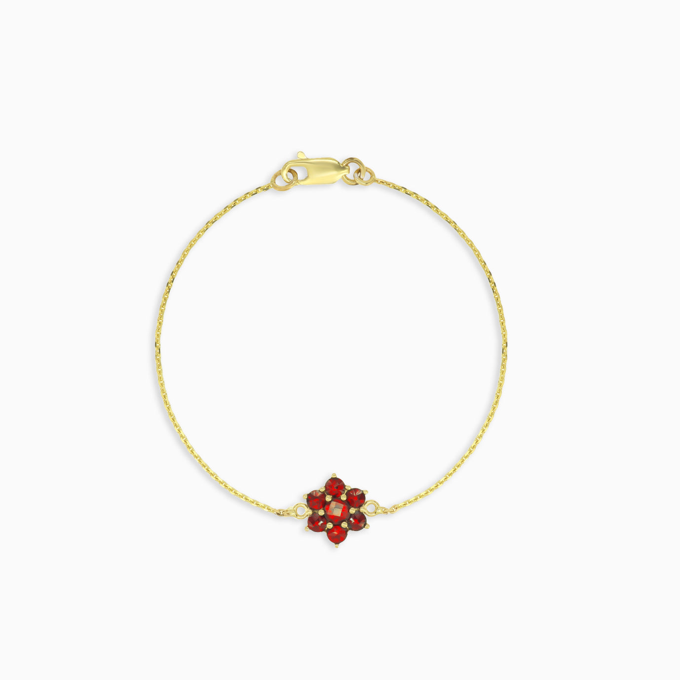 Tento nádherný dámský náramek je vyroben ze 14karátového žlutého zlata a představuje krásný květinový vzor z kulatých granátů. Zářivě červené kameny jsou uspořádány do jemného květinového vzoru, zasazeny do zářezů a zajištěny humřími sponami, což z tohoto náramku činí jedinečný a elegantní doplněk pro každou příležitost.