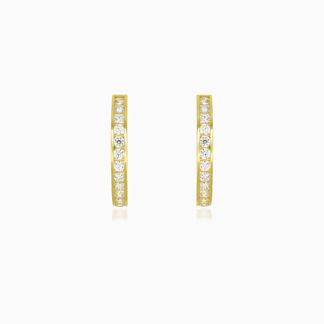 Dámské náušnice z obruče ze 14kt žlutého zlata s kulatým jemným zirkonem ve stupňovitém výbrusu. Tyto náušnice se vyznačují puzetovým osazením a bezpečným objímkovým zapínáním a nabízejí nadčasový a rafinovaný design vhodný pro každodenní nošení i zvláštní příležitosti.