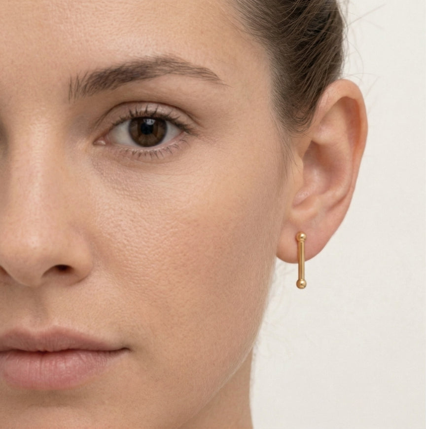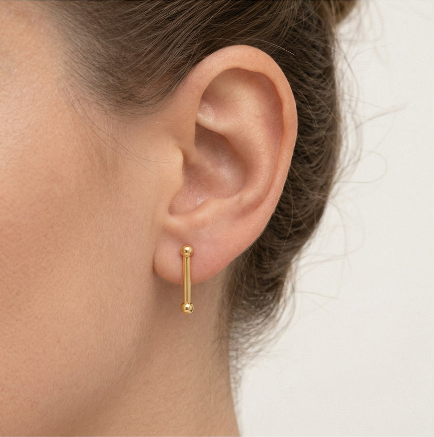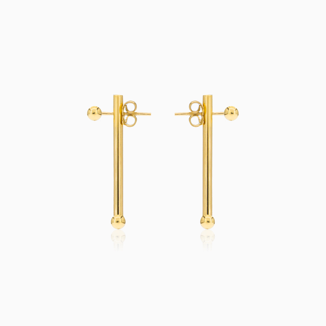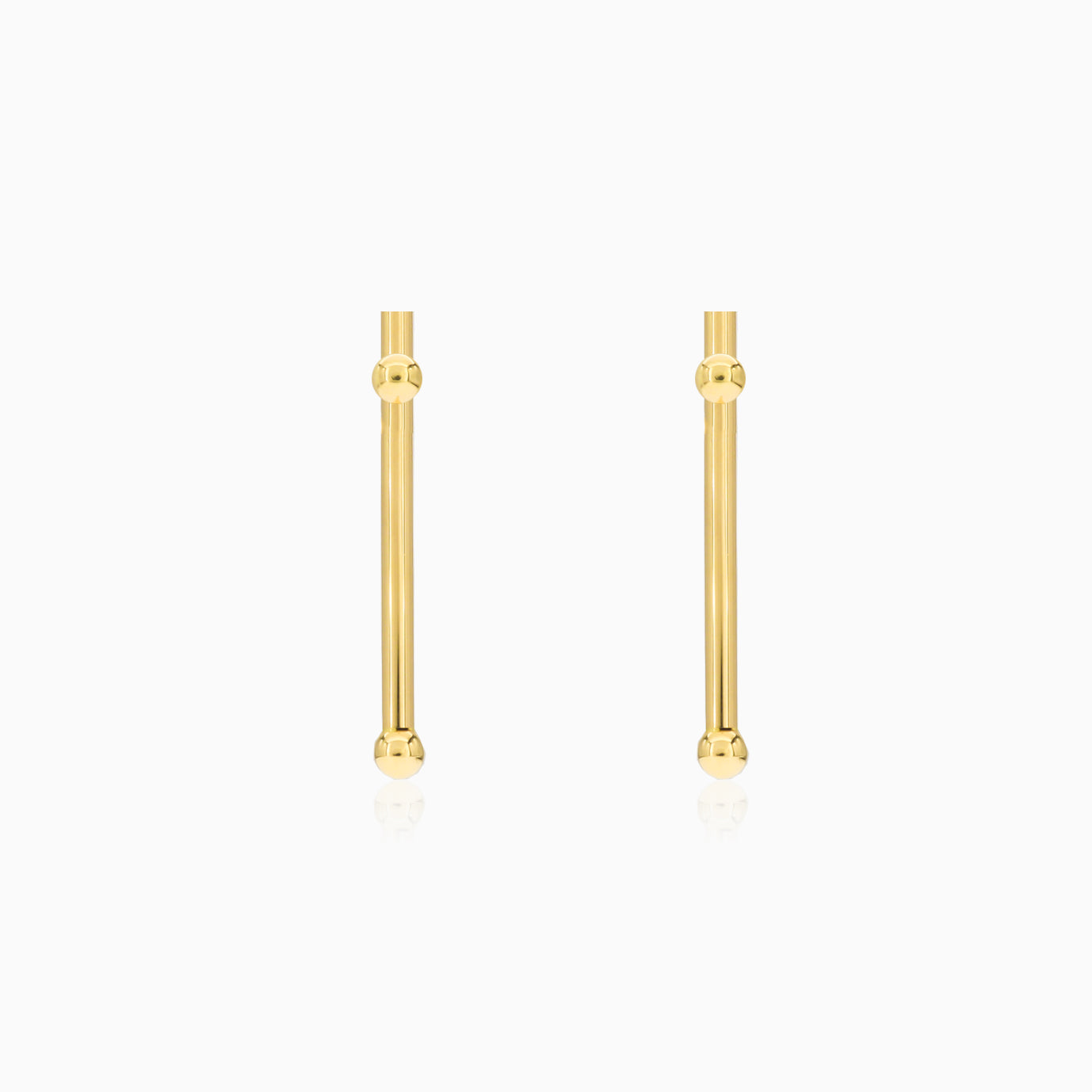 Originální náušnice z 14k žlutého zlata s 3,5 cm dlouhou tyčkou, která prochází za uchem, zdobená dvěma zlatými kuličkami na každé náušnici.