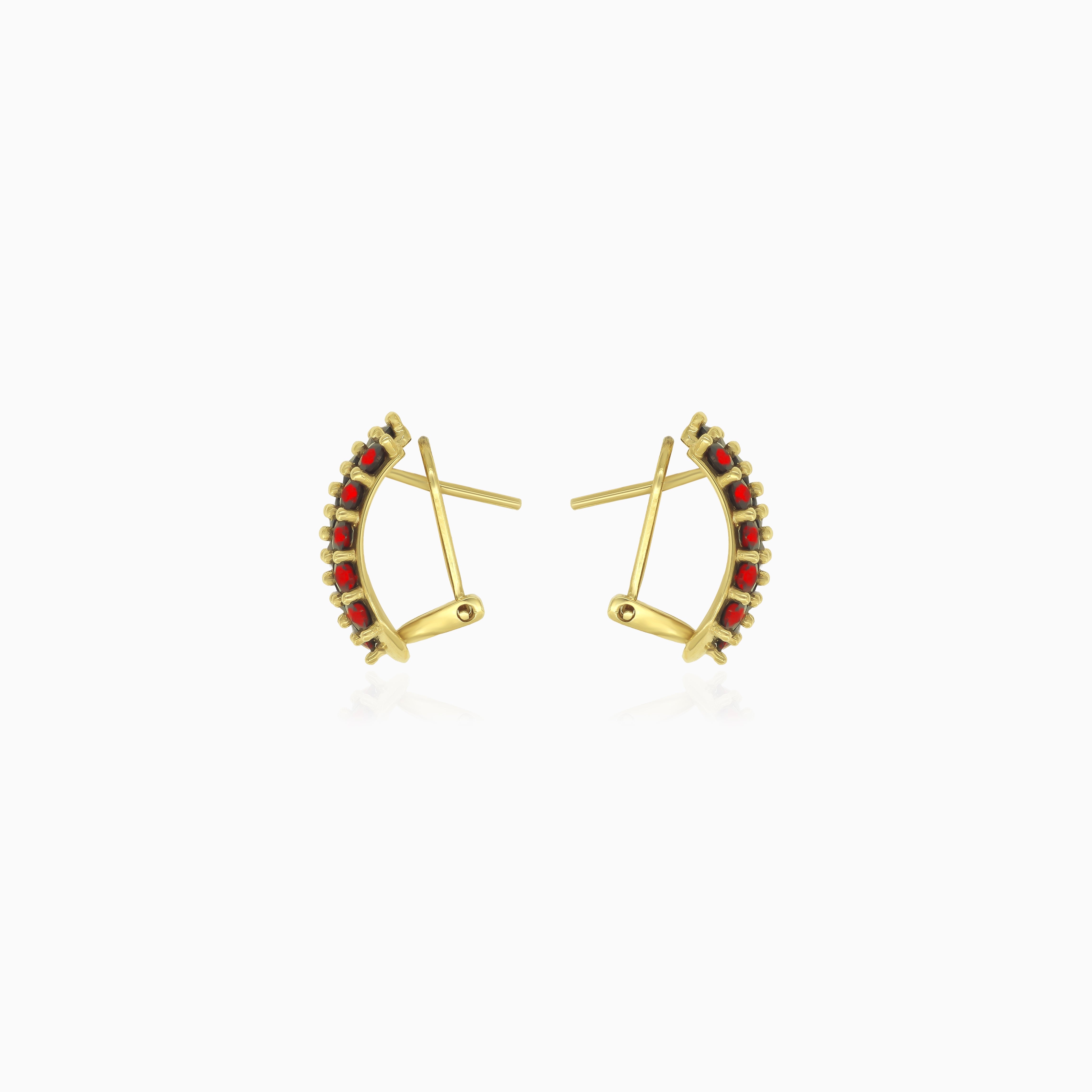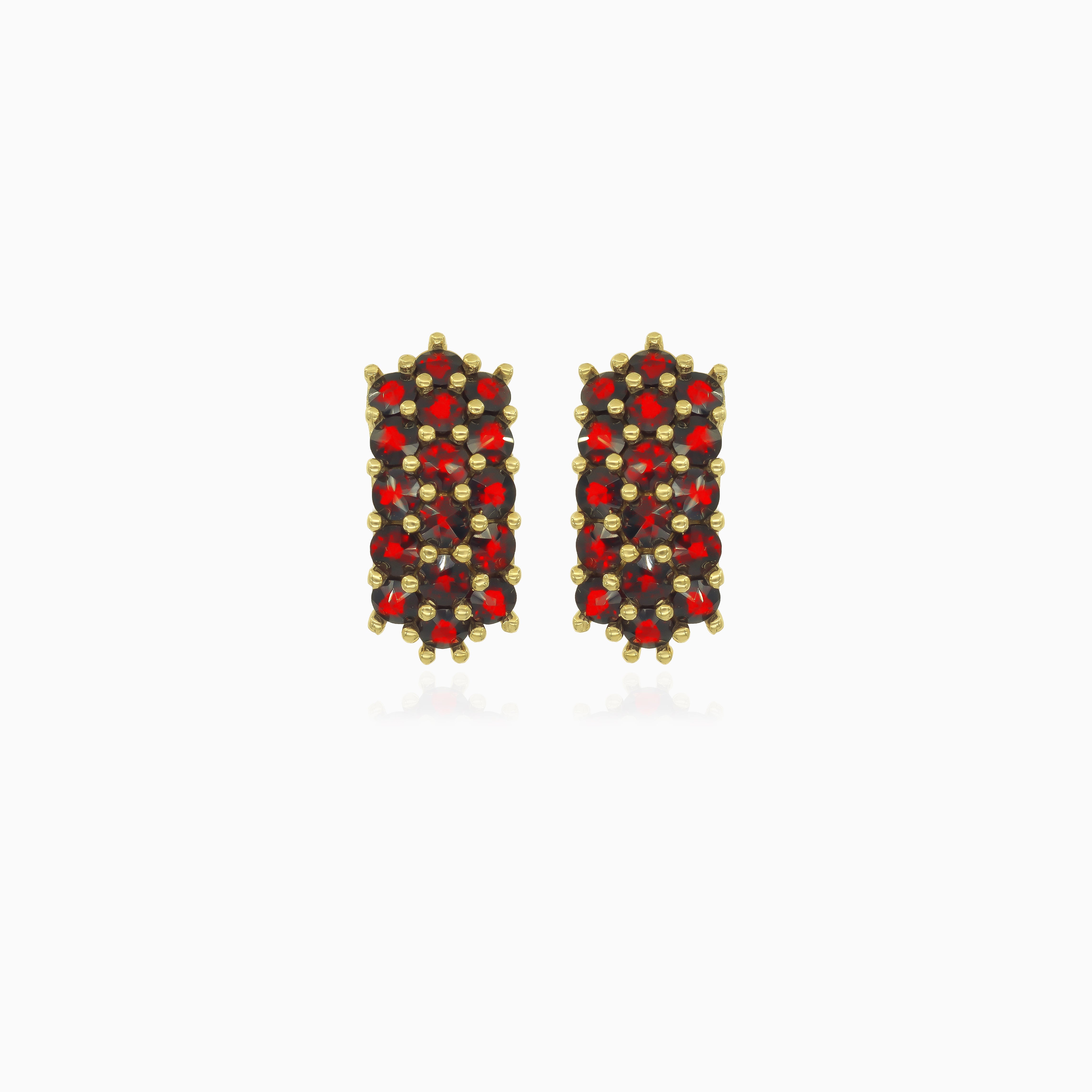 Tyto odvážné dámské náušnice ze 14kt žlutého zlata se pyšní třemi řadami kulatých granátů jemného stupňovitého brusu zasazených v bezpečném zasazení s hroty a zapínáním omega back. Sytě červené granáty a masivní, elegantní design dělají z těchto náušnic výrazný kousek, ideální pro ty, kdo hledají luxus a poutavou krásu.