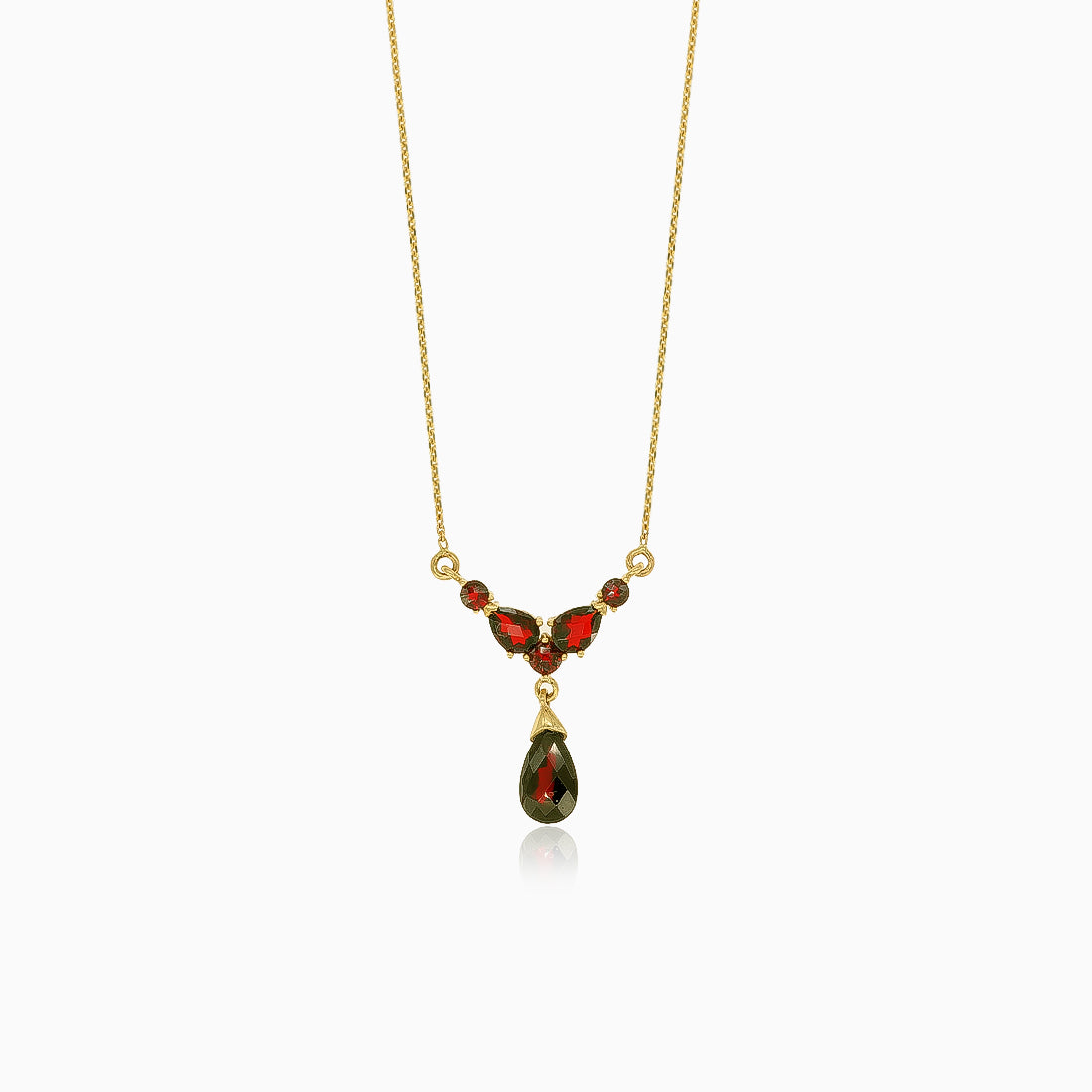 Ozdobte se elegancí v tomto dámském náhrdelníku s kulatými jemnými stupňovitě broušenými granáty a briolettovými kapkami hruškového brusu. Náhrdelník je vyroben ze 14kt žlutého zlata s bezpečným zasazením a zapínáním na humří sponu a dodá každému outfitu nádech sofistikovanosti.