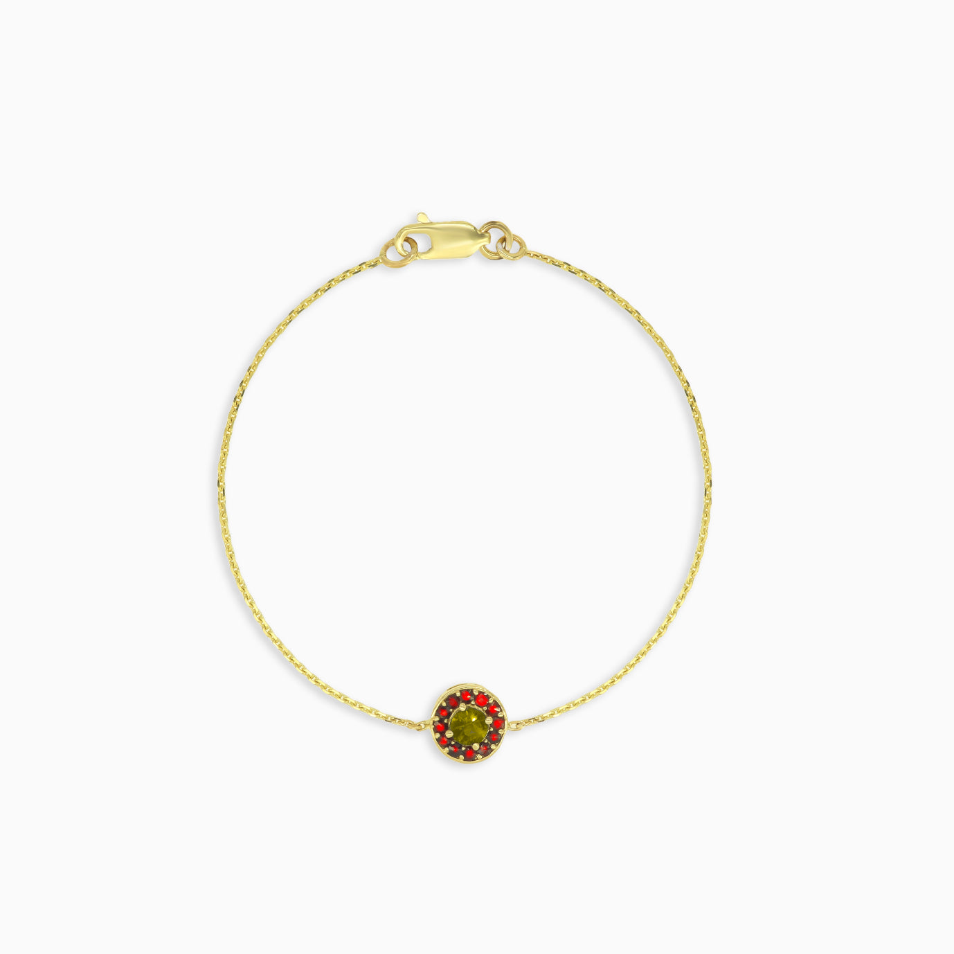 Objevte dokonalou kombinaci elegance a živosti v našem náramku ze 14kt žlutého zlata. Tento podmanivý šperk je vybaven kulatým jemným stupňovitě broušeným vltavínem a granátem, které jsou zajištěny humřími sponami a důmyslným zasazením s hroty pro harmonický a poutavý design.