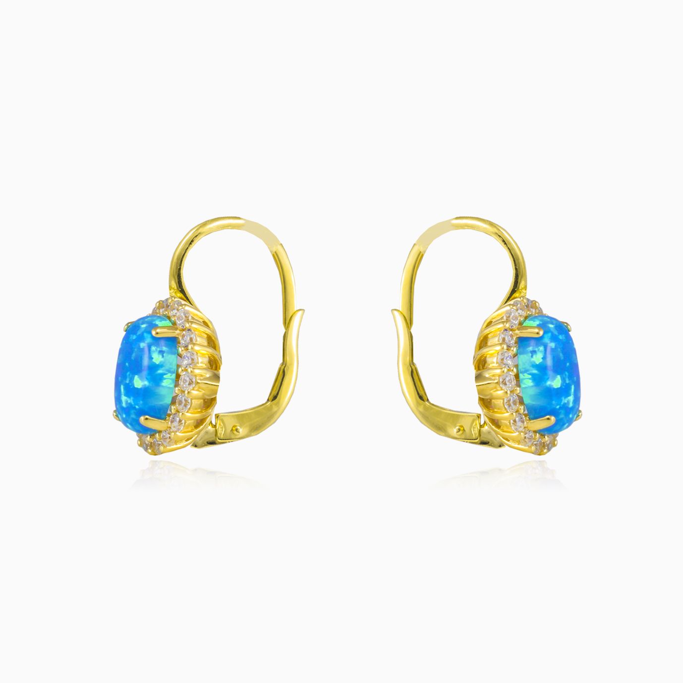 Náušnice z 14-karátového žlutého zlata s modrým opálem a aureolou z kubické zirkonie.