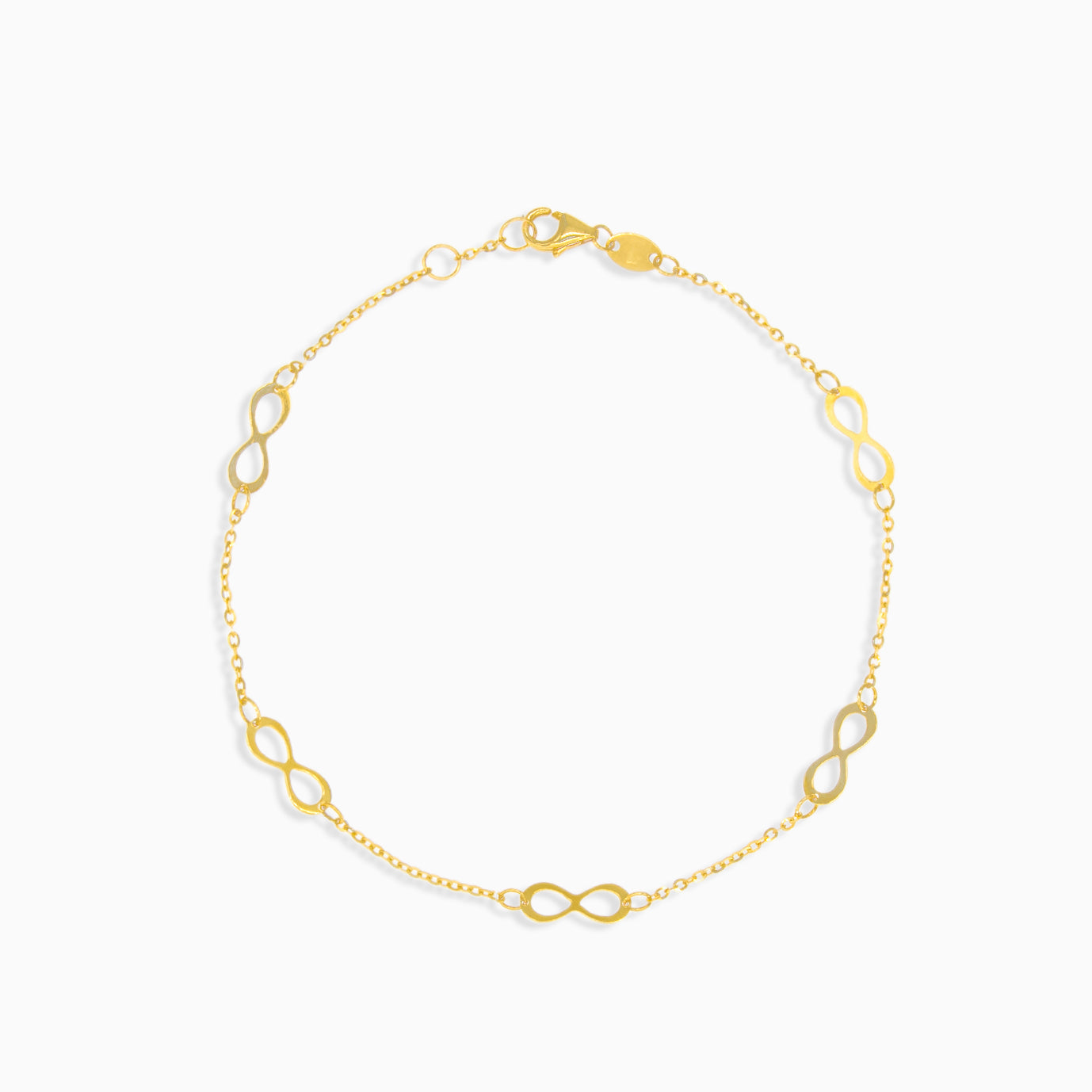 Zvyšte svůj styl tímto jednoduchým a přesto elegantním zlatým náramkem ze 14kt zlata se více vzory nekonečna. Náramek je uzavratelný karabinkovým zámkem.