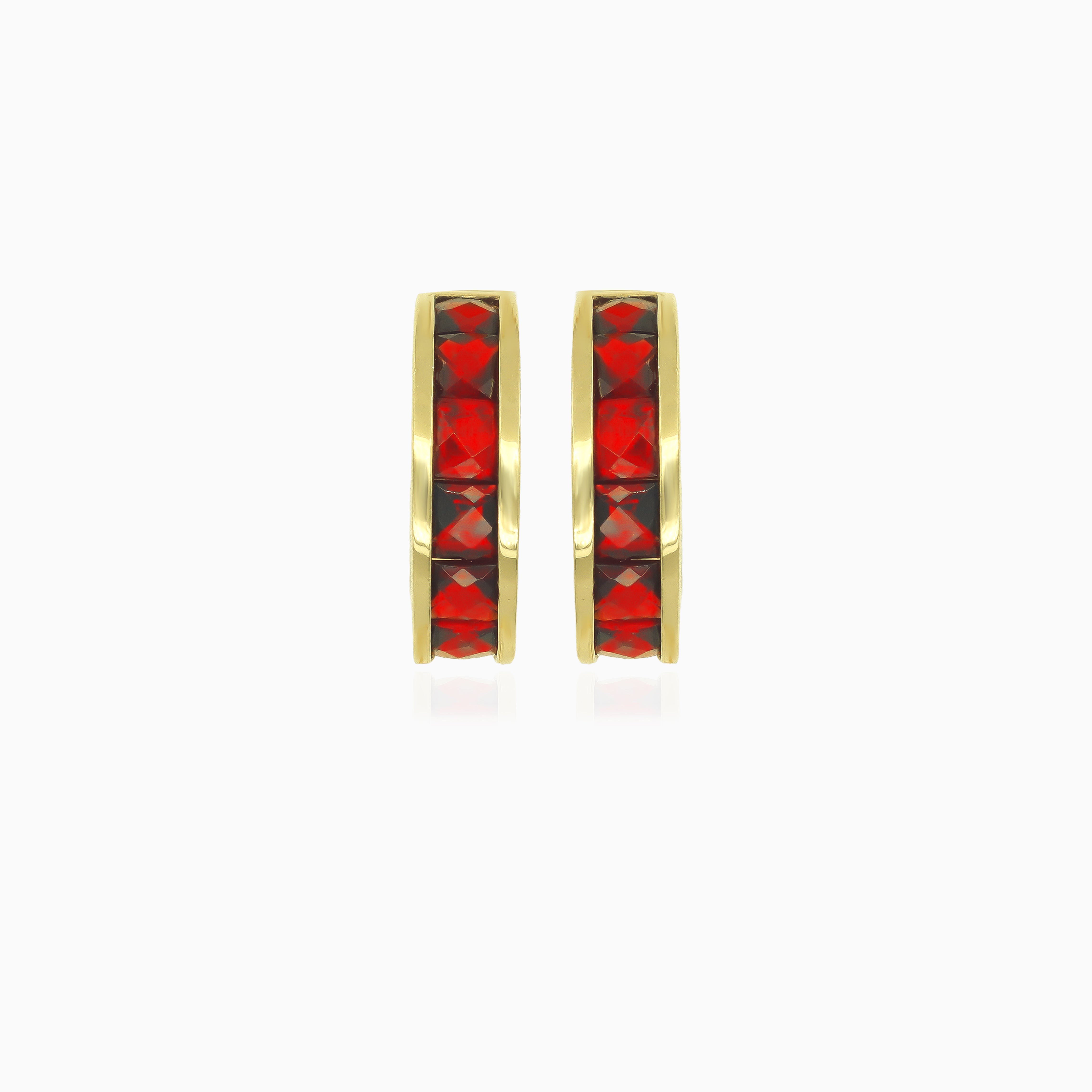 Tyto elegantní dámské náušnice jsou vyrobeny ze 14karátového žlutého zlata a zdobí je úchvatné granáty ve čtvercovém princesovém výbrusu. Kanálové zasazení zvýrazňuje sytě červené kameny a nabízí jednoduchý, ale sofistikovaný design s objímkovým zapínáním pro větší bezpečnost. Ideální pro ty, kdo ocení rafinované, nadčasové šperky.