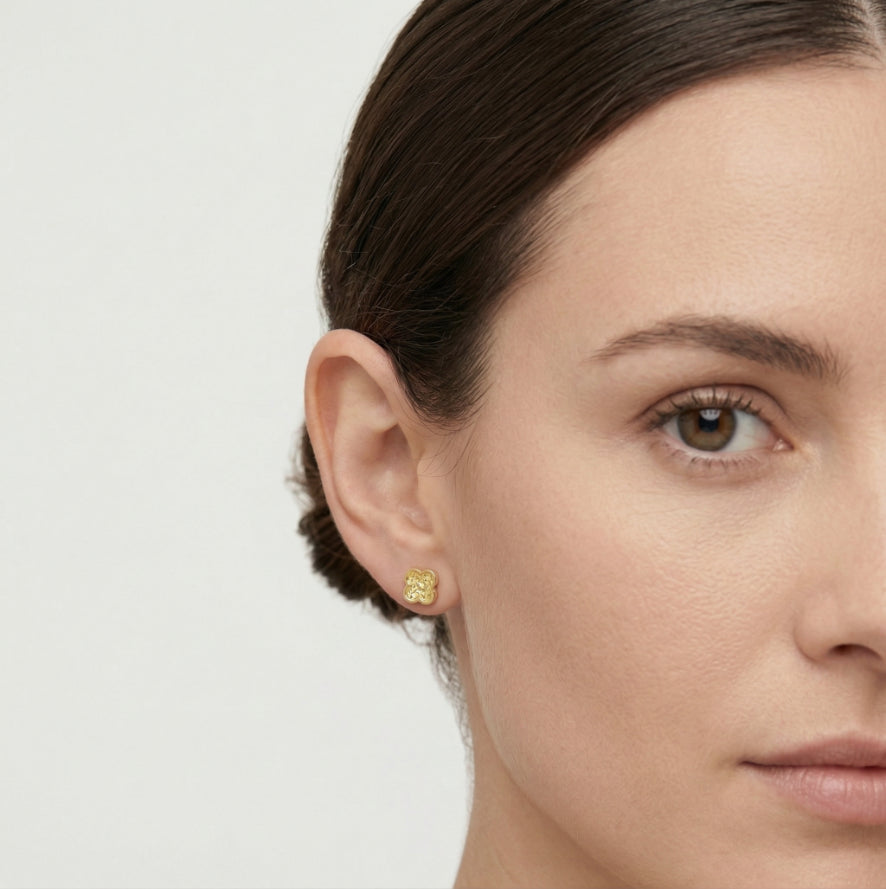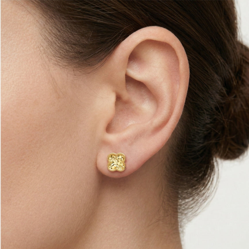 Symbolické puzetové náušnice ze 14kt žlutého zlata bez kamínků s puzetovým zapínáním, ztělesňující nadčasovou eleganci.