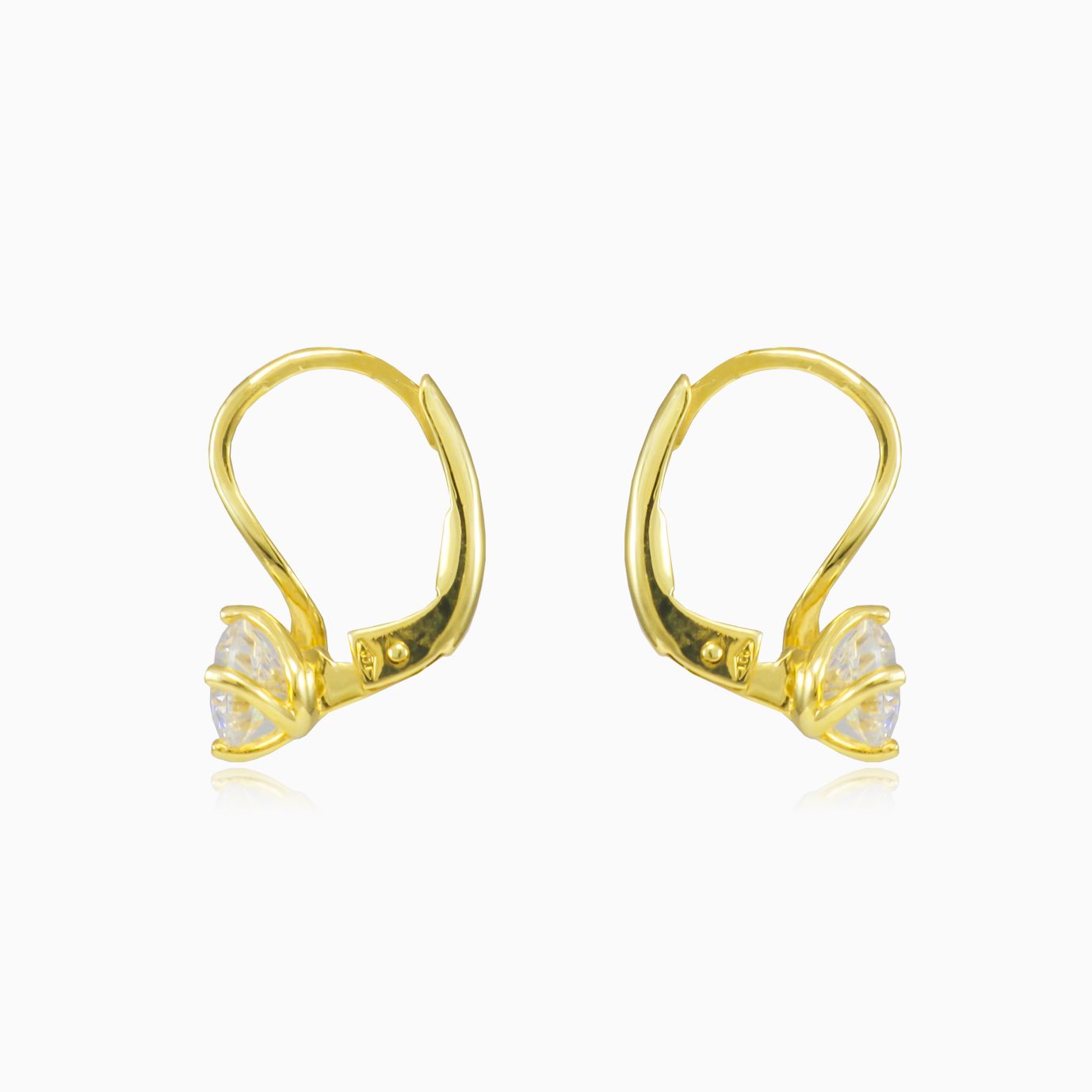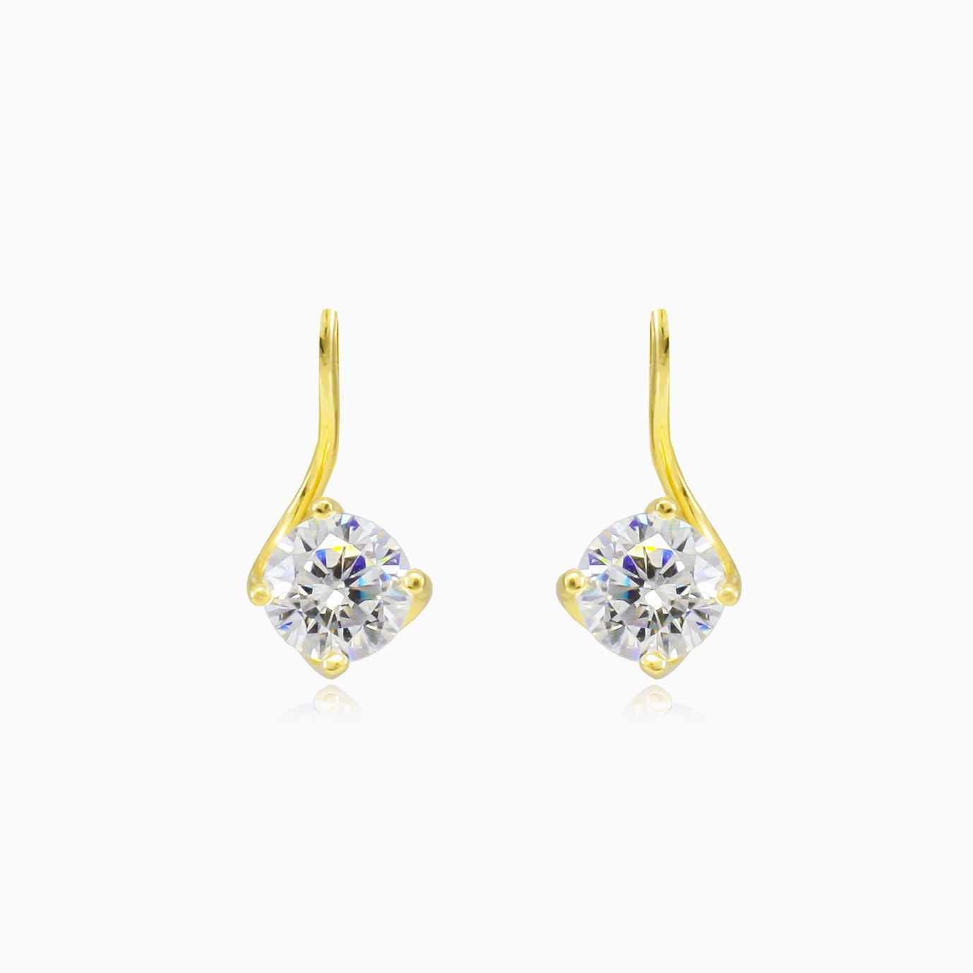 Současné kroucené solitérní náušnice ze 14K žlutého zlata kombinované s kulatým broušeným kubickým zirkonem chráněným čtyřmi krapnami.