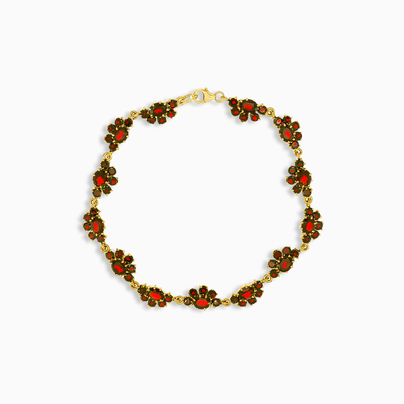 Ozdobte své zápěstí elegancí tohoto dámského náramku s oválnými a kulatými granáty jemného krokového brusu zasazenými do 14kt žlutého zlata s osazením záhybem. Náramek je zakončen humřím zapínáním a zdobí ho jemné květinové akcenty, které dodají každému outfitu šmrnc.