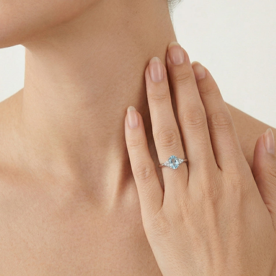 Vylepšete svůj styl tímto nádherným dámským prstenem vyrobeným ze 14kt bílého zlata. Tento prsten s kulatými jemnými stupňovitě broušenými diamanty a podmanivým oválným modrým topazem ve čtyřpaprskovém zasazení je symbolem elegance a sofistikovanosti.