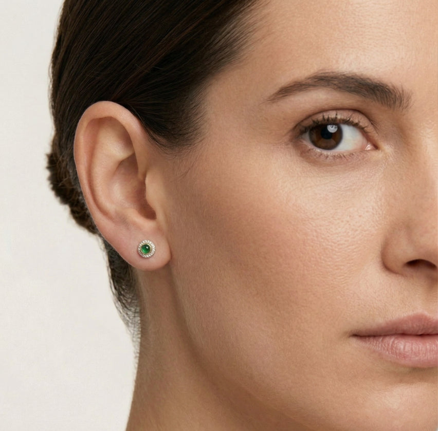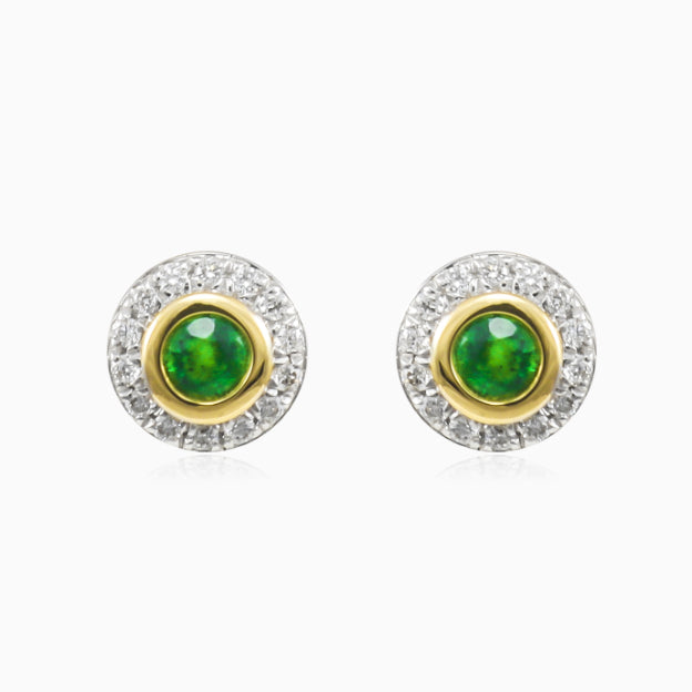 Náušnice z 14-karátového žlutého zlata se smaragdem v luneta osazení obklopeným diamanty.