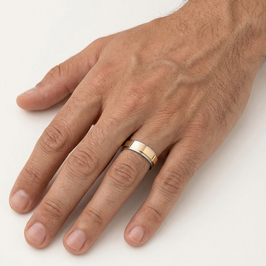 Poznejte eleganci našich snubních prstenů ze 14kt žlutého a bílého zlata pro muže i ženy. První prsten je vybaven volitelným kubickým zirkonem nebo diamantem o celkové hmotnosti 0,02 ct s kulatým jemným stupňovitým výbrusem a zasazením v rámečku. Druhý prsten je hladký. jedinečný design předvádí žluté zlato na horní straně prstenu. s tloušťkou 5 mm, kombinující moderní styl s nadčasovou sofistikovaností.