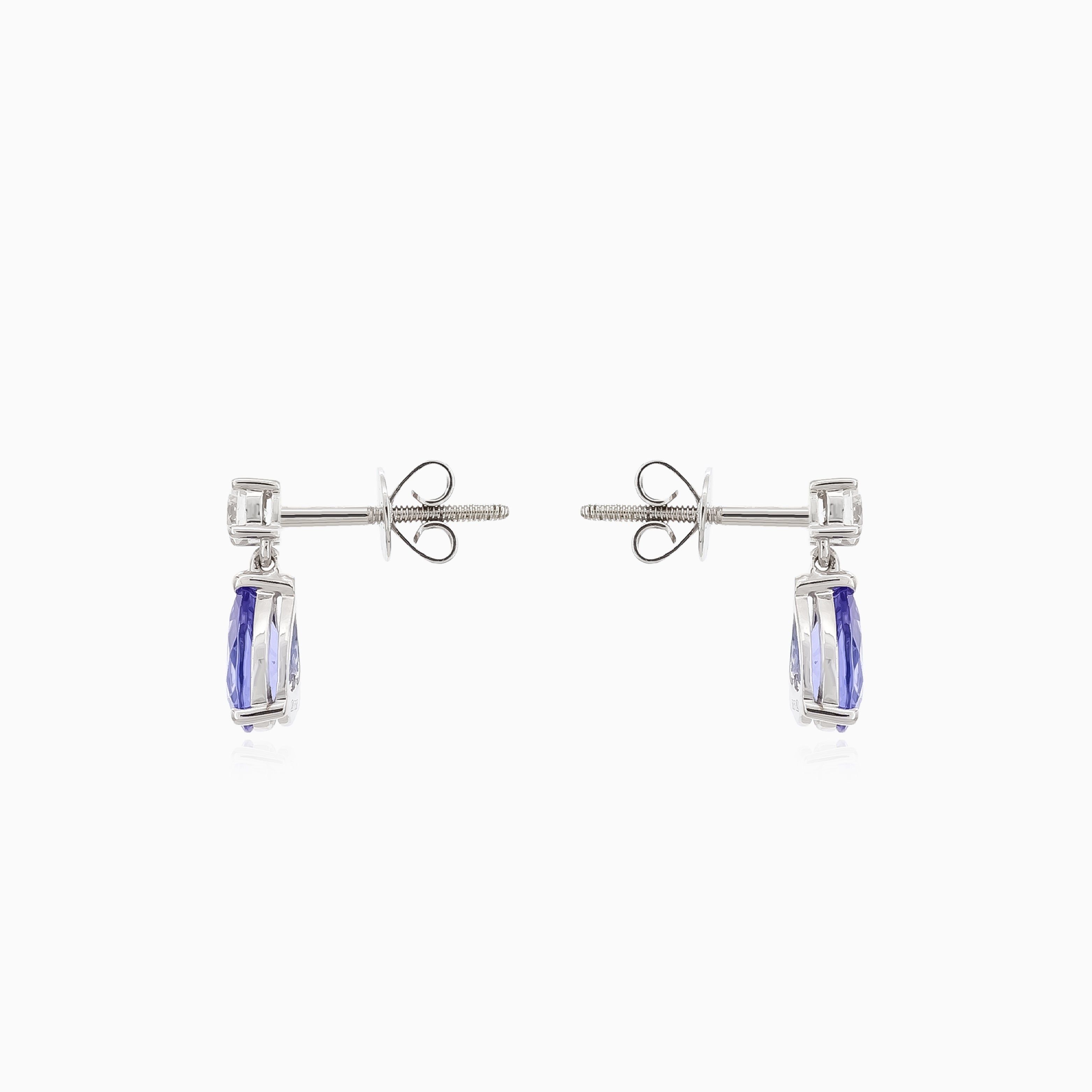 Tyto luxusní náušnice ze 14kt bílého zlata jsou zdobeny úchvatným tanzanitem ve tvaru kapky o hmotnosti 1,22ct a diamanty kulatého tvaru o hmotnosti 0,22ct. Mají zapínání na šroubek a diamanty se pyšní nepřekonatelnou čistotou VS1 a barvou G.