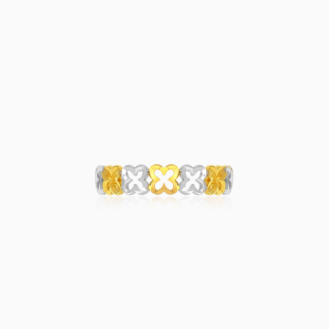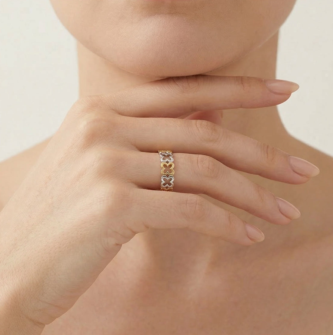 Ozdobte svůj prst elegancí v podobě našeho dámského prstenu ze 14kt žlutého a bílého zlata, který je zdoben jemným květinovým vzorem a působí nadčasově.