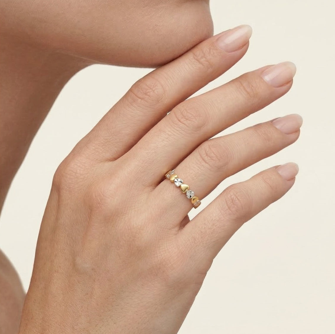 Úžasný dámský prsten ze 14karátového žlutého a bílého zlata s vysoce leštěnou povrchovou úpravou vyzařuje nadčasovou eleganci a rafinovanost.