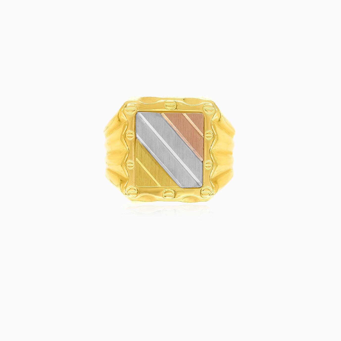 Pánský prsten z vysoce leštěného 14kt žlutého, bílého a růžového zlata je nadčasovým a univerzálním doplňkem.
