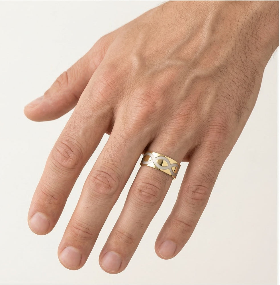 Tento nápadný snubní prsten z bílého a žlutého 14kt zlata je určen pro ženy i muže a má silný 8mm prsten bez kamenů. Jeho velmi zajímavý design vyniká složitými detaily, které z něj dělají výjimečný kousek. Tento prsten je ideální pro páry, které hledají odvážný a sofistikovaný vzhled, a nabízí moderní pojetí klasické elegance.
